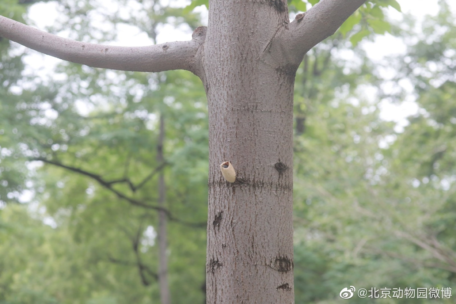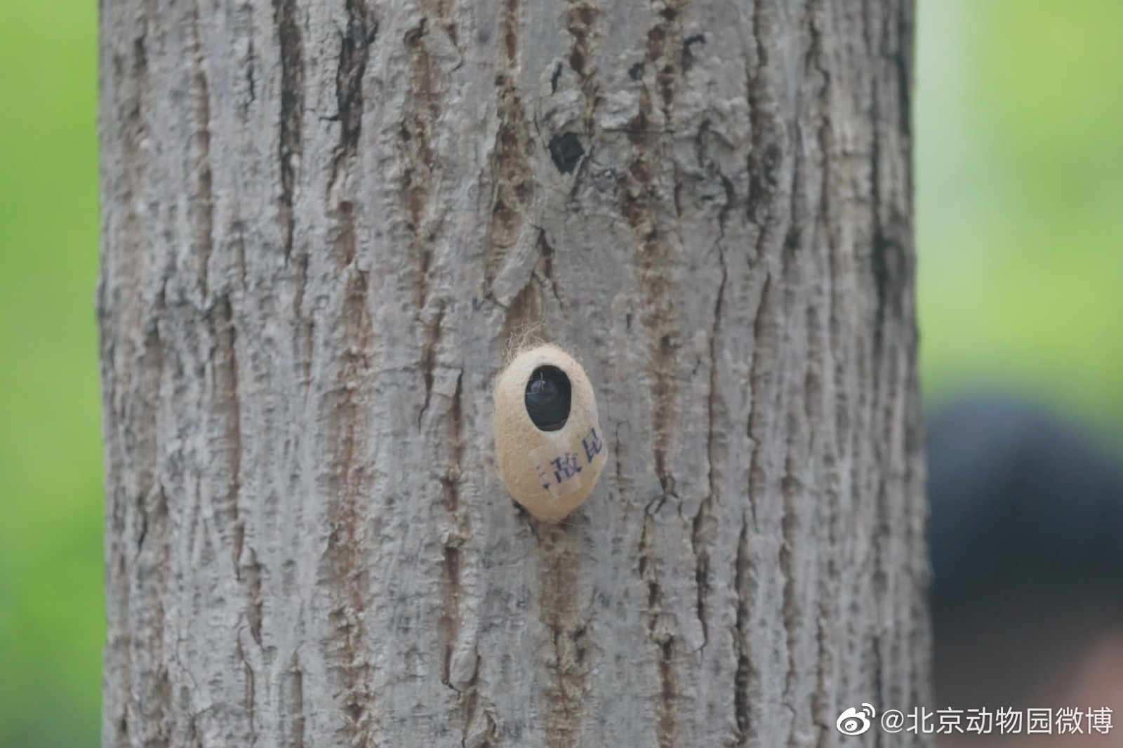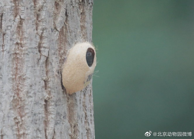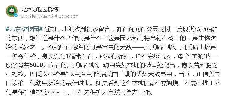北京动物园微博今天发文回应:这是园艺部门特意钉在树上的,是生物防治的武器之一。蚕蛹里面藏着的可是害虫的天敌——周氏啮小蜂。