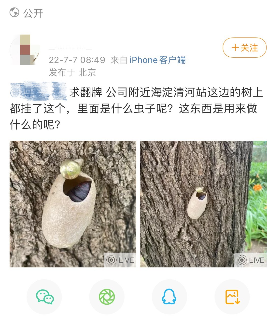 多位北京网友发帖求助:树上挂的什么?蚕蛹?蝉?专业科普了解一下→