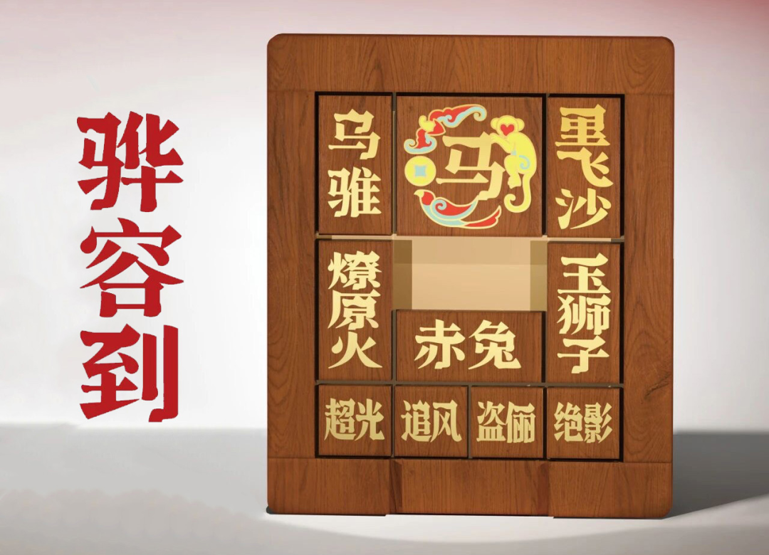 作品《骅容到》不仅是对智慧的考验,更是一件承载着传统文化的现代吉祥物——它以华容道的谋略之思、三国历史的英雄之气,以及一匹承载吉祥纹样的骏马,传递了事业顺遂与五福临门的美好寓意。
