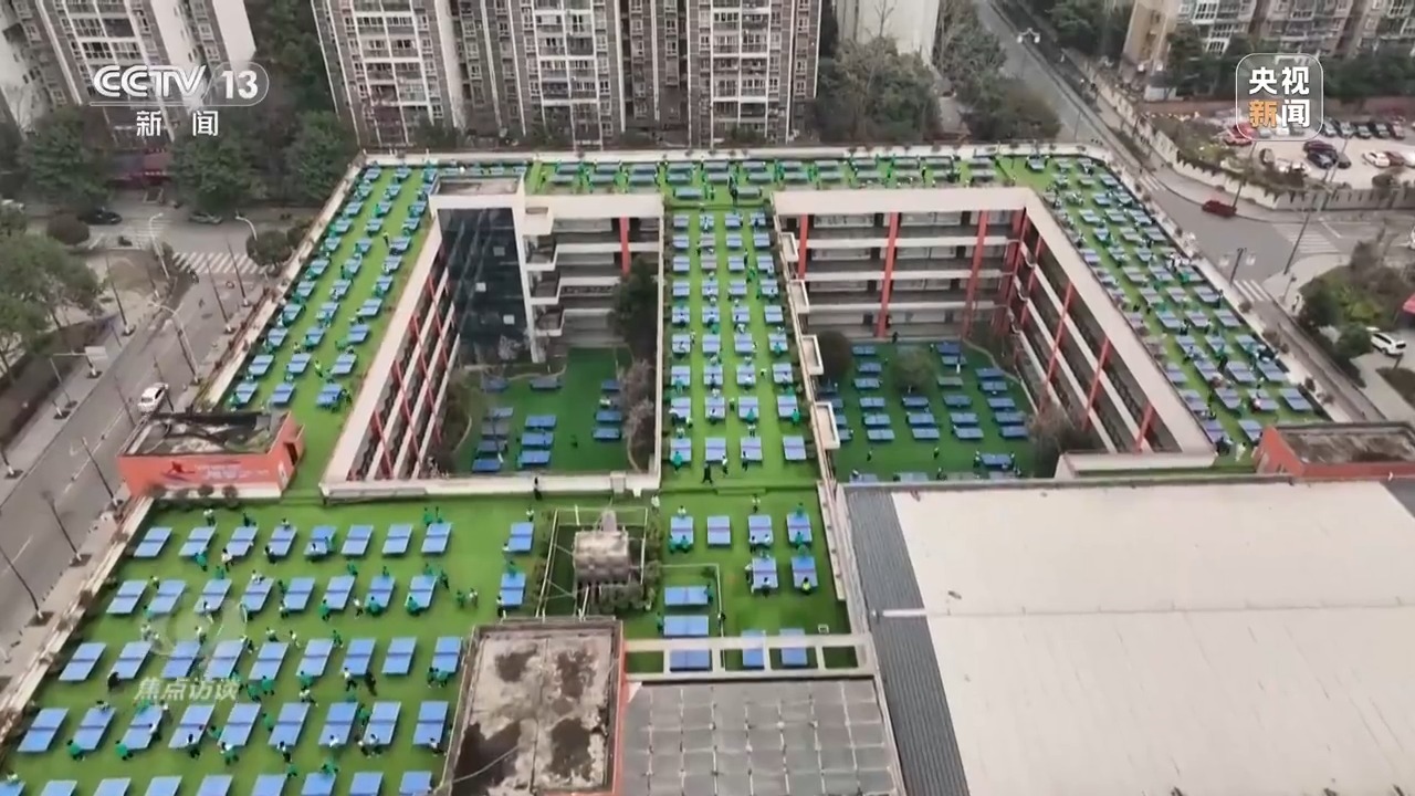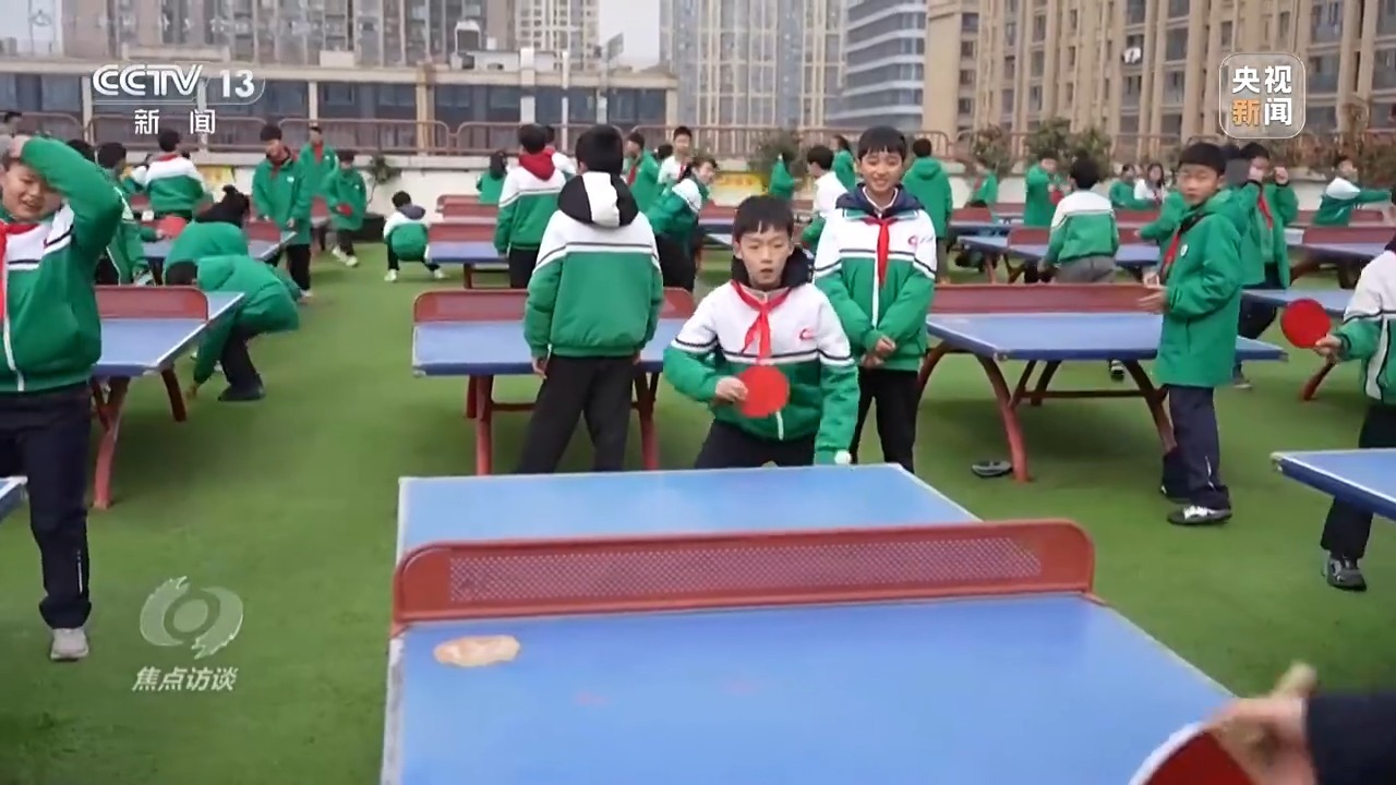 十点刚过,位于四川成都的电子科技大学附属实验小学的孩子们走出教室,来到了学校屋顶。从无人机的视角看过去,校园里乒乓球桌密布,俨然是一个乒乓学校。