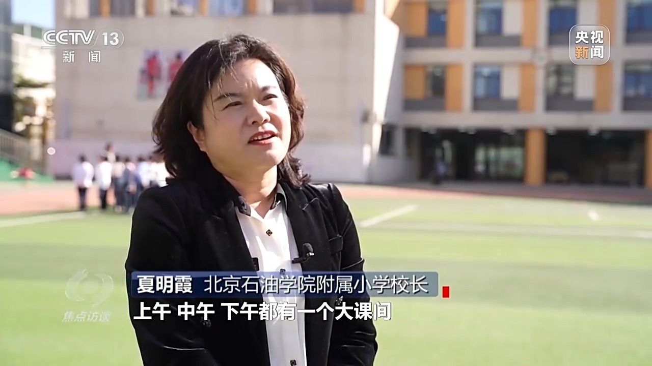 北京石油学院附属小学校长 夏明霞:跟去年相比,体育活动的时间增长了。比如我们每天上午、中午、下午都有一个大课间,各30分钟,每天还有一节体育课,再加上课间15分钟,一天下来将近3个小时的体育锻炼时间。我们这学期还增加了比赛的次数,让月月有比赛,周周有比赛,班班有比赛。