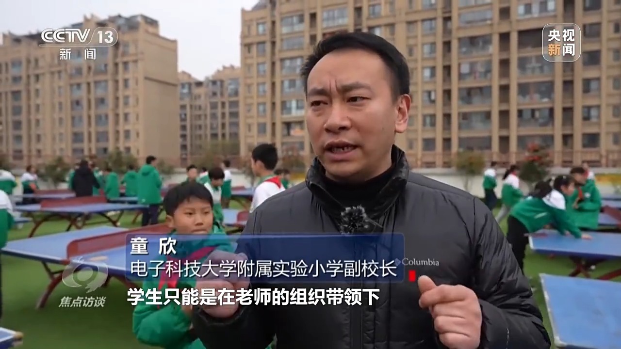 电子科技大学附属实验小学副校长 童欣:我们这是一个网红楼顶,华泰校区楼顶一共有208张乒乓球桌,能够同时满足9个班的学生一起在楼顶进行乒乓球运动。
