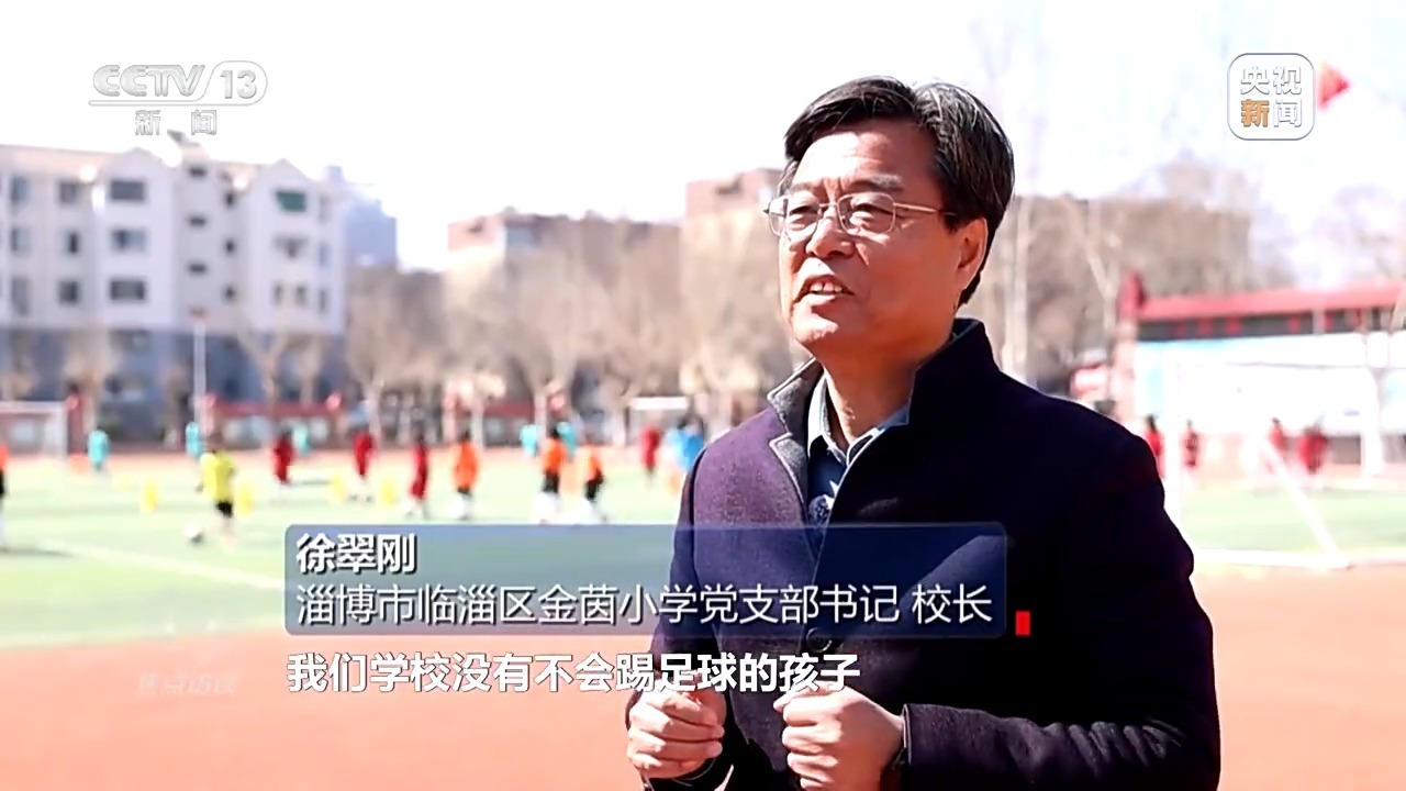 淄博市临淄区金茵小学党支部书记、校长 徐翠刚:我们学校没有不会踢足球的孩子,我们每周一节足球课,专门训练足球。我们还有活动支撑,四级联赛就是让每个孩子都参与当中来。
