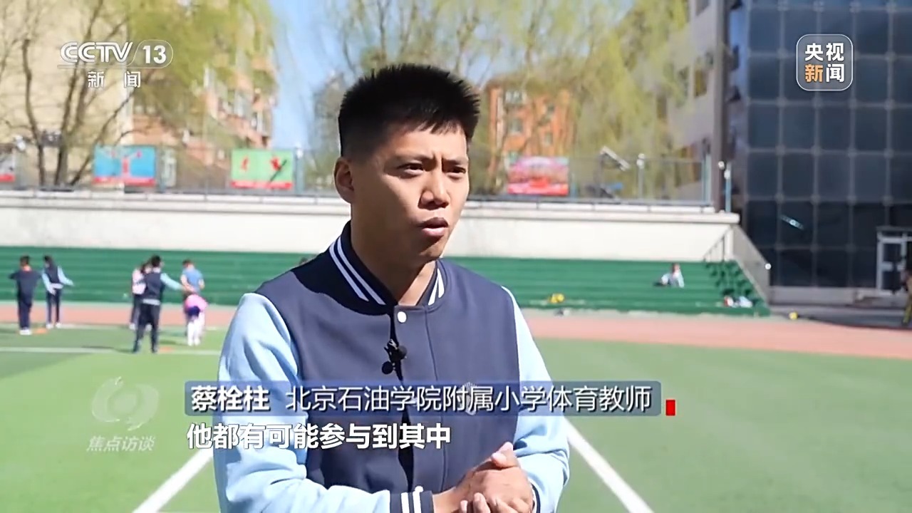 北京石油学院附属小学体育教师 蔡栓柱:从学校的角度来说,每个孩子都有可能参与其中。他可能不参加篮球联赛,但可能参加足球联赛,可能参加花样跳绳,总有展示的平台。