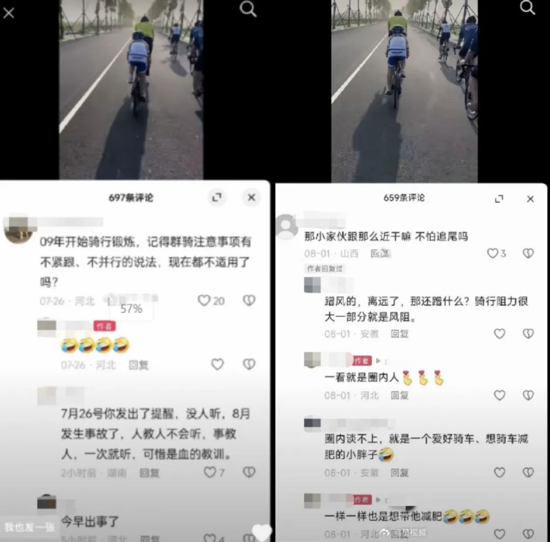 此前,有网友曾在该父亲的骑行视频下留言,提醒群骑应不紧跟、不并行,指出小男孩跟车太近易追尾,该父亲回复网友表示是在“蹭风”,想带孩子骑车减肥。目前,该视频账号内容已不可见。
