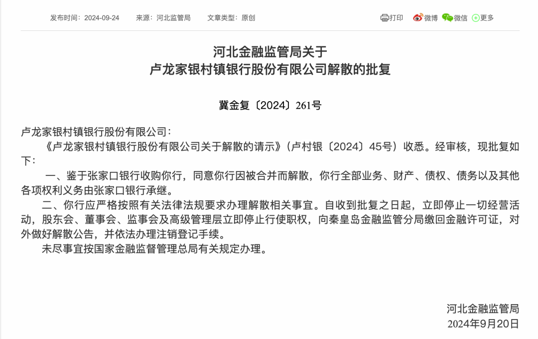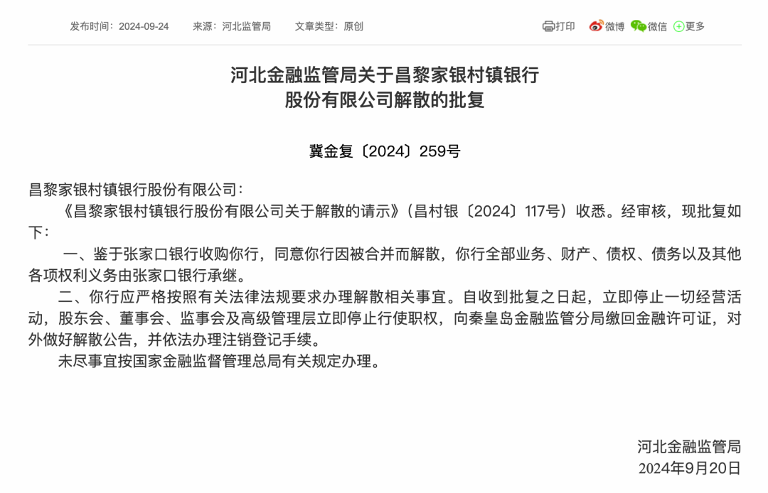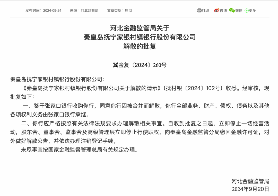 批复文件显示,9月20日,河北金融监管局同意昌黎家银村镇银行、秦皇岛抚宁家银村镇银行、卢龙家银村镇银行解散。