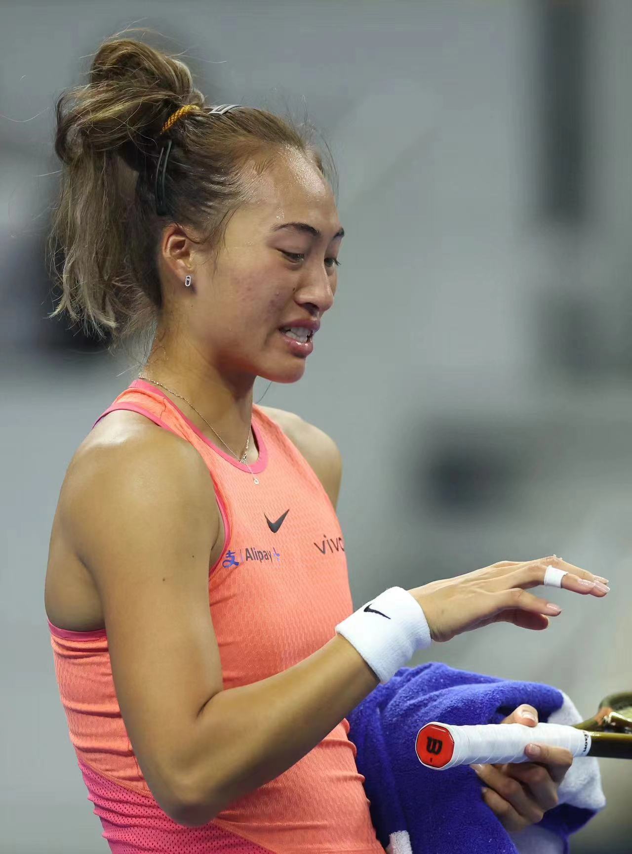 “我很清楚自己为什么会摔倒,因为精神不集中,身体太累了,脚下没站稳。”摔倒后,郑钦文在场上躺了好一会儿,她说手掌青了,三个手指头也破皮流血了。加上左边屁股摔得很疼,场上跑动也受影响。