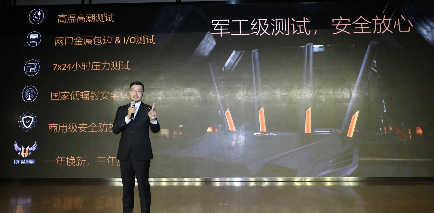 n华硕电脑开放平台中国区总经理俞元麟,针对华硕路由市场及TUF GAMING AX3000定位演讲