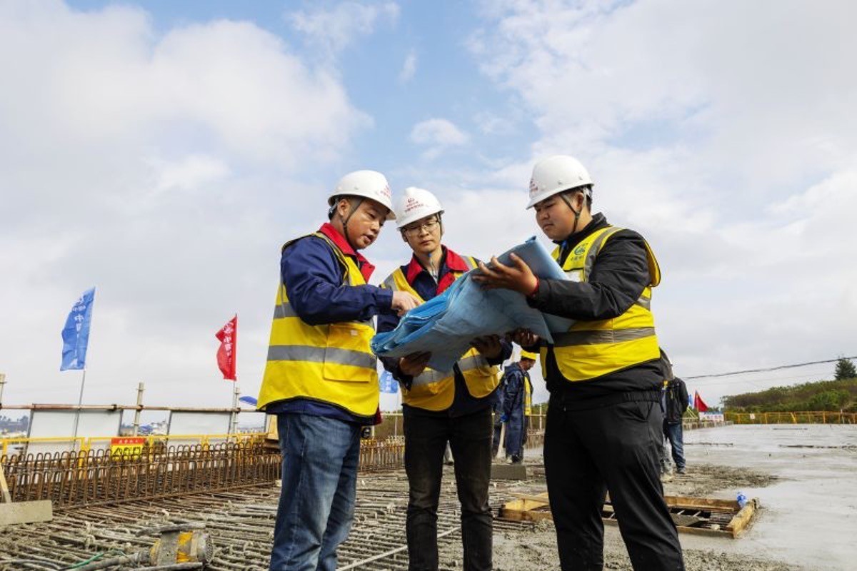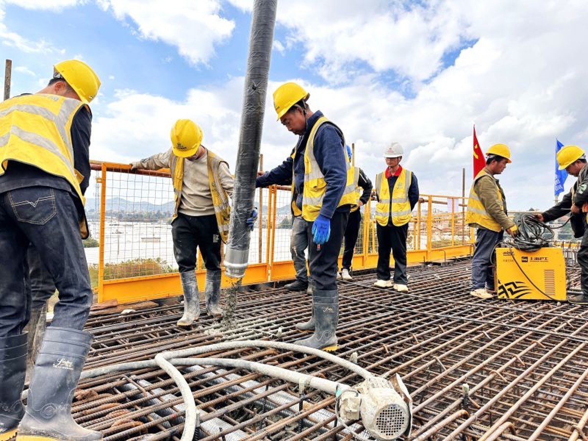 “施工过程中,为确保进度和质量,参建各方进行多次施工方案比选研讨,严格施工方案审查,加强与地方政府的沟通协调,完善下穿公路的交通疏导,强化临近高铁的安全防护。”中铁四局渝昆高铁昆明枢纽总工程师邓志标介绍,由于大桥结构和工艺的特殊性,浇筑工作需不间断持续进行,他们在现场成立了党团员突击队,形成昼夜两班倒轮换作业。这次连续梁浇筑用时一天一夜,各方紧密配合,确保连续梁浇筑的顺利完成,既保证了施工进度有序推进,又保障了相邻公路和高铁的正常运行。