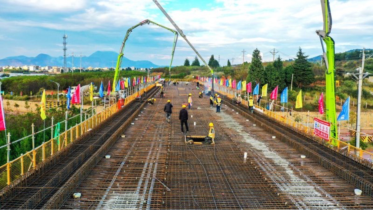 此次完成连续梁混凝土浇筑的嵩明蔡家村3号大桥,位于云南省昆明市嵩明县境内,主跨连续梁为三跨,与沪昆高铁平行、上跨乡村公路,连续梁为钢筋混凝土箱梁,梁面宽度12.6米,梁底宽度5.5米,采用支架现浇法施工,这座桥梁从进场施工到连续梁浇筑完成仅用4个月时间。