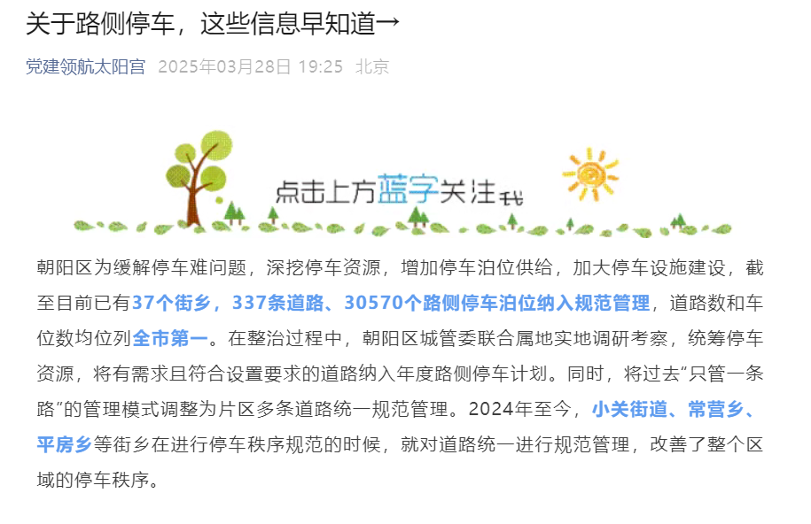 为缓解辖区停车难问题,保障周边居民停车权益,太阳宫地区坚持“向前一步”,多次组织召开路侧工作相关会议,在朝阳区城管委等相关部门指导下,协同社区、辖区企业等多方力量,围绕车位规划、宣传引导、应急响应等环节周密部署,科学规划设计停车位650个,进一步缓解停车紧张情况、规范停车秩序,让路侧停车更贴民心、更顺民意。