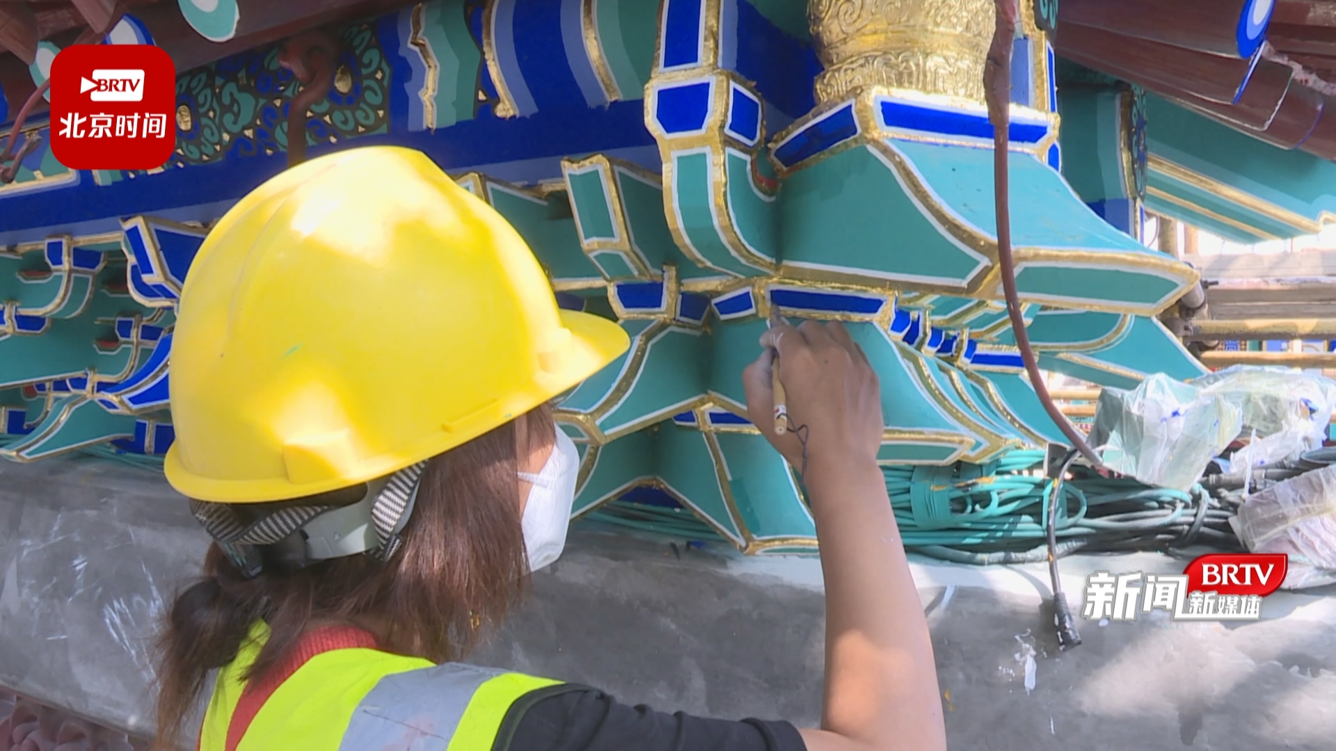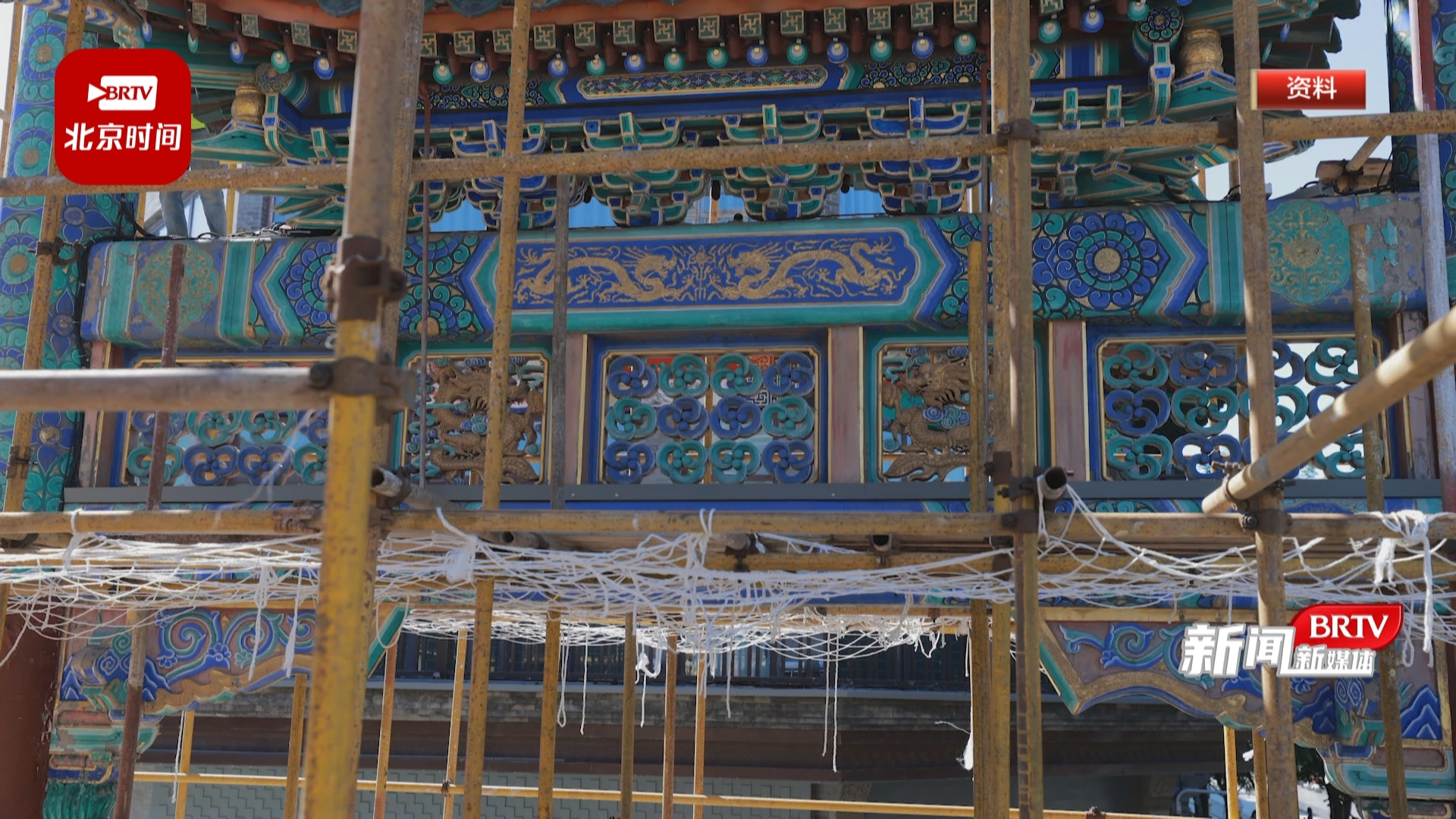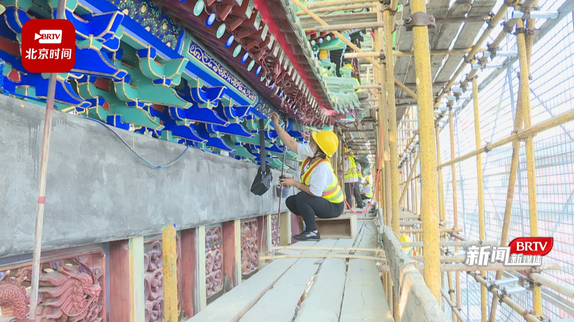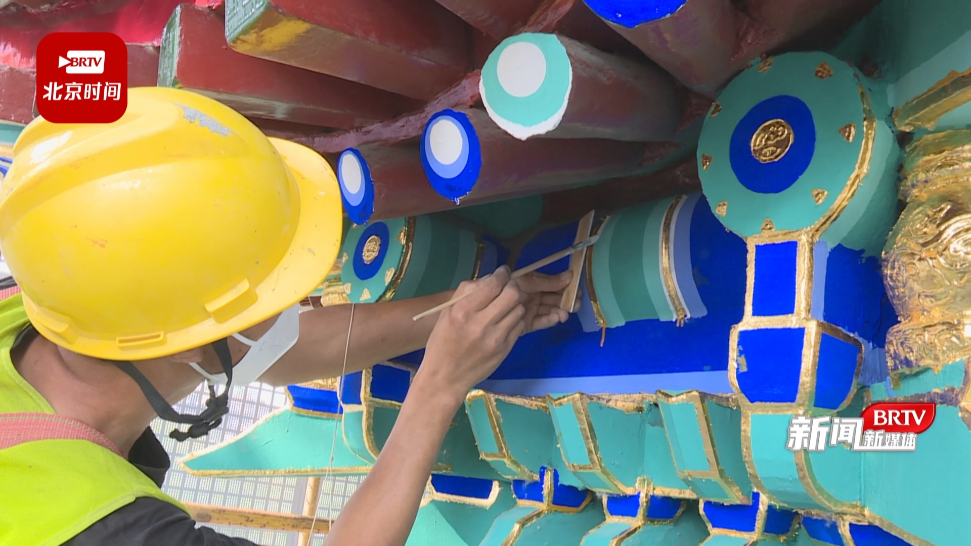 记者探访前门五牌楼时看到,整个建筑已被施工围挡合围,高高的脚手架上,彩绘师傅正精心勾勒图案。