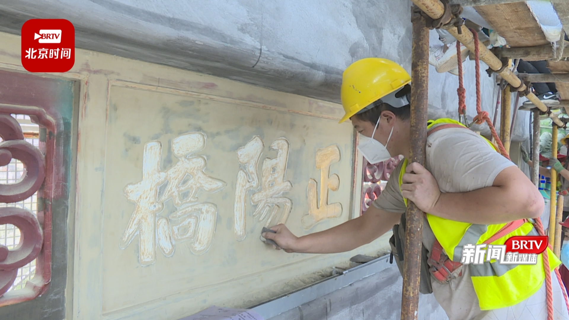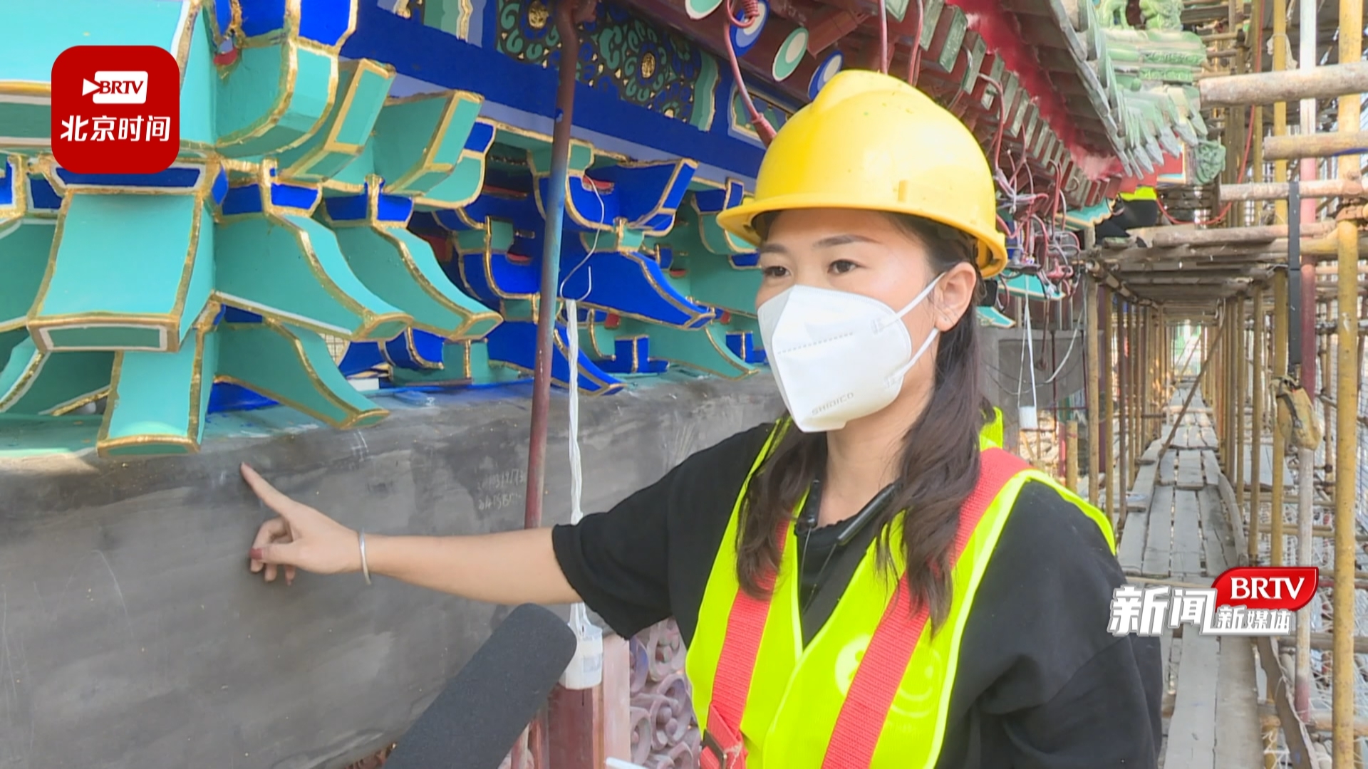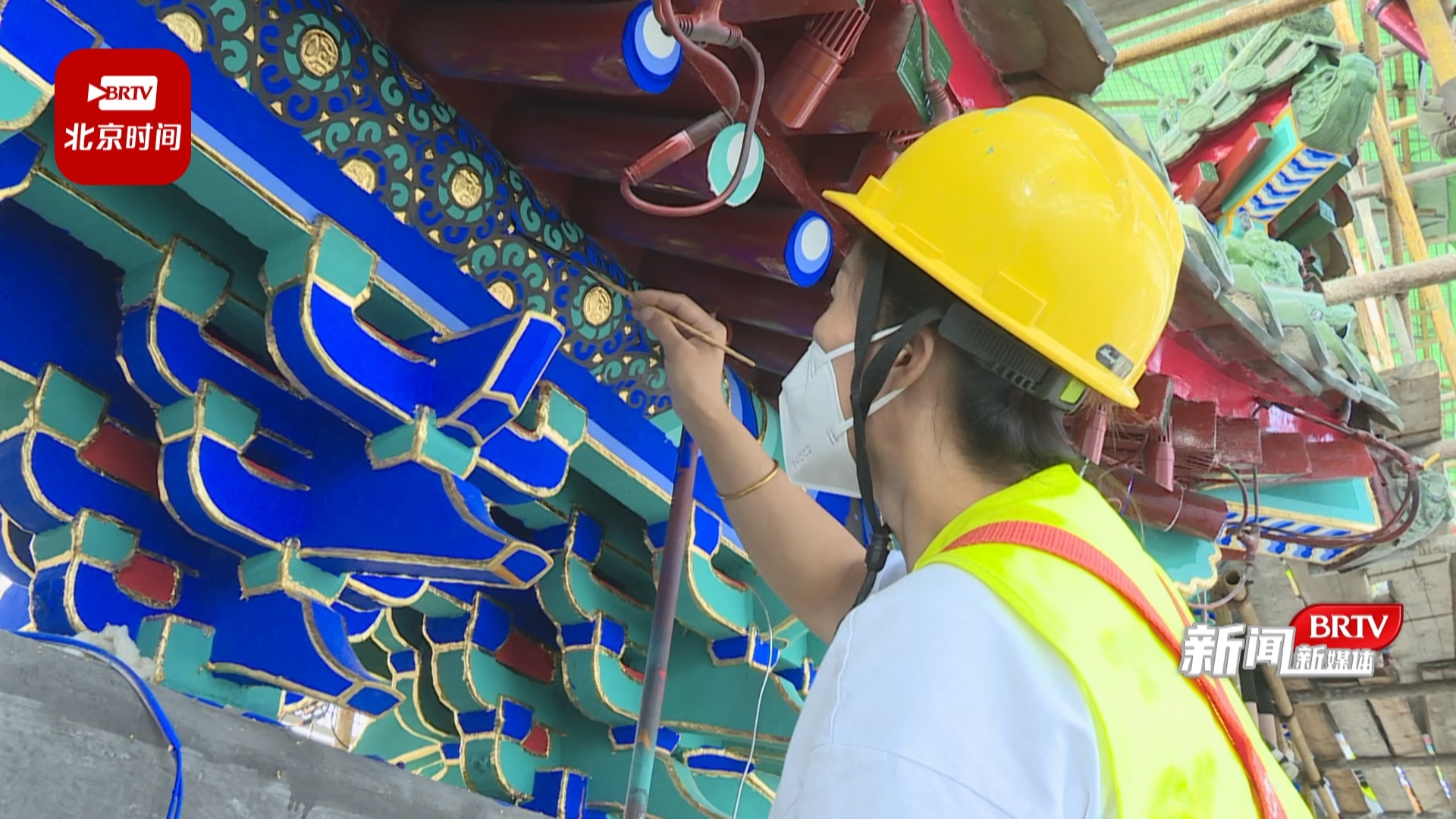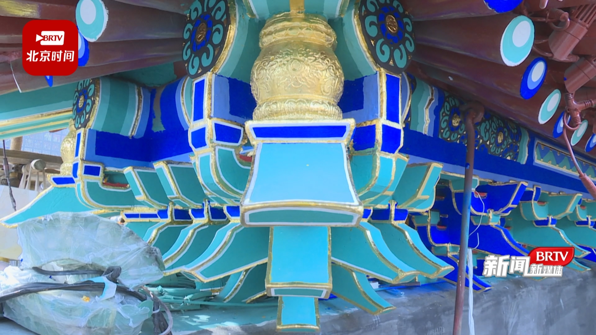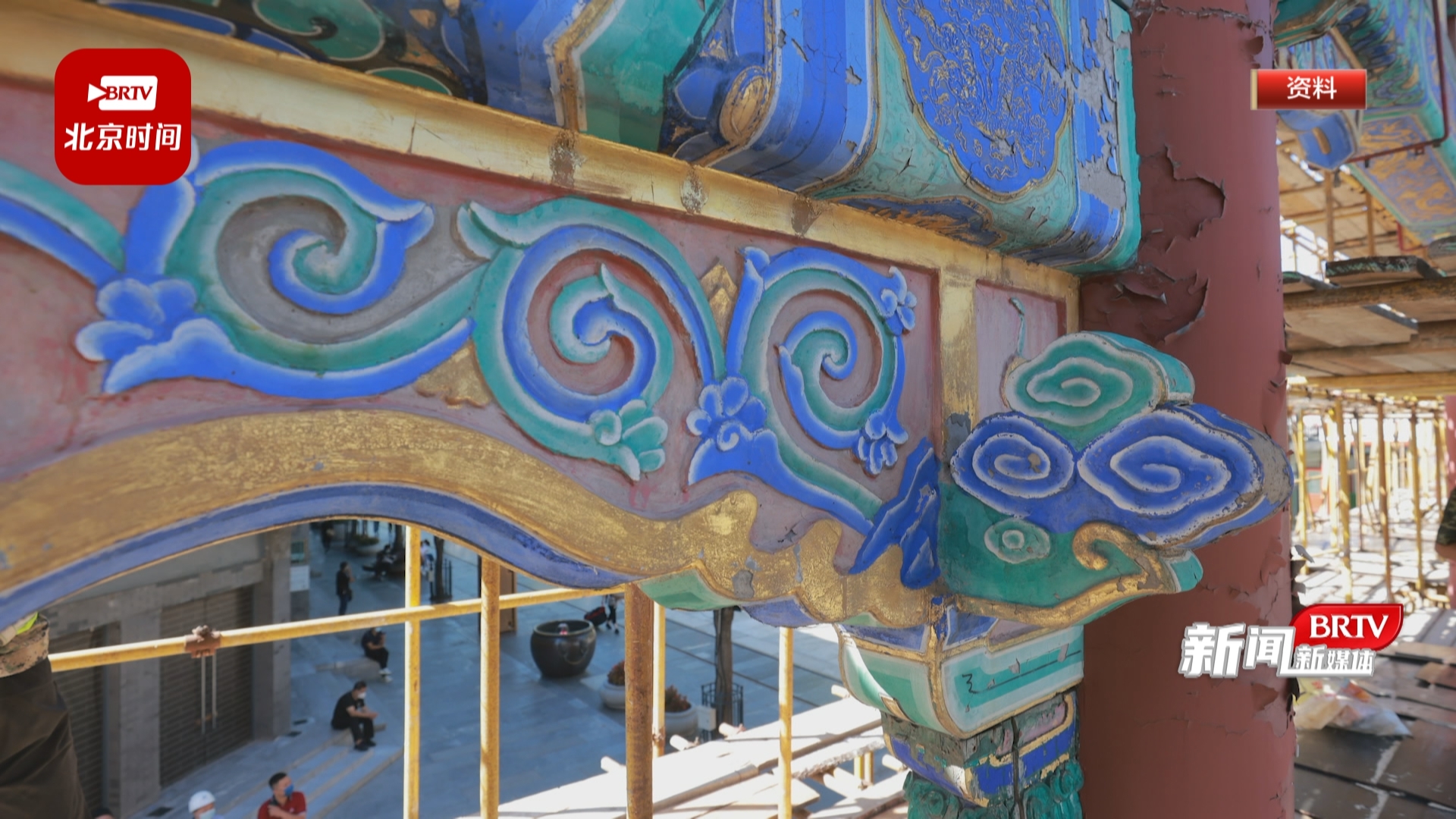 记者探访前门五牌楼时看到,整个建筑已被施工围挡合围,高高的脚手架上,彩绘师傅正精心勾勒图案。