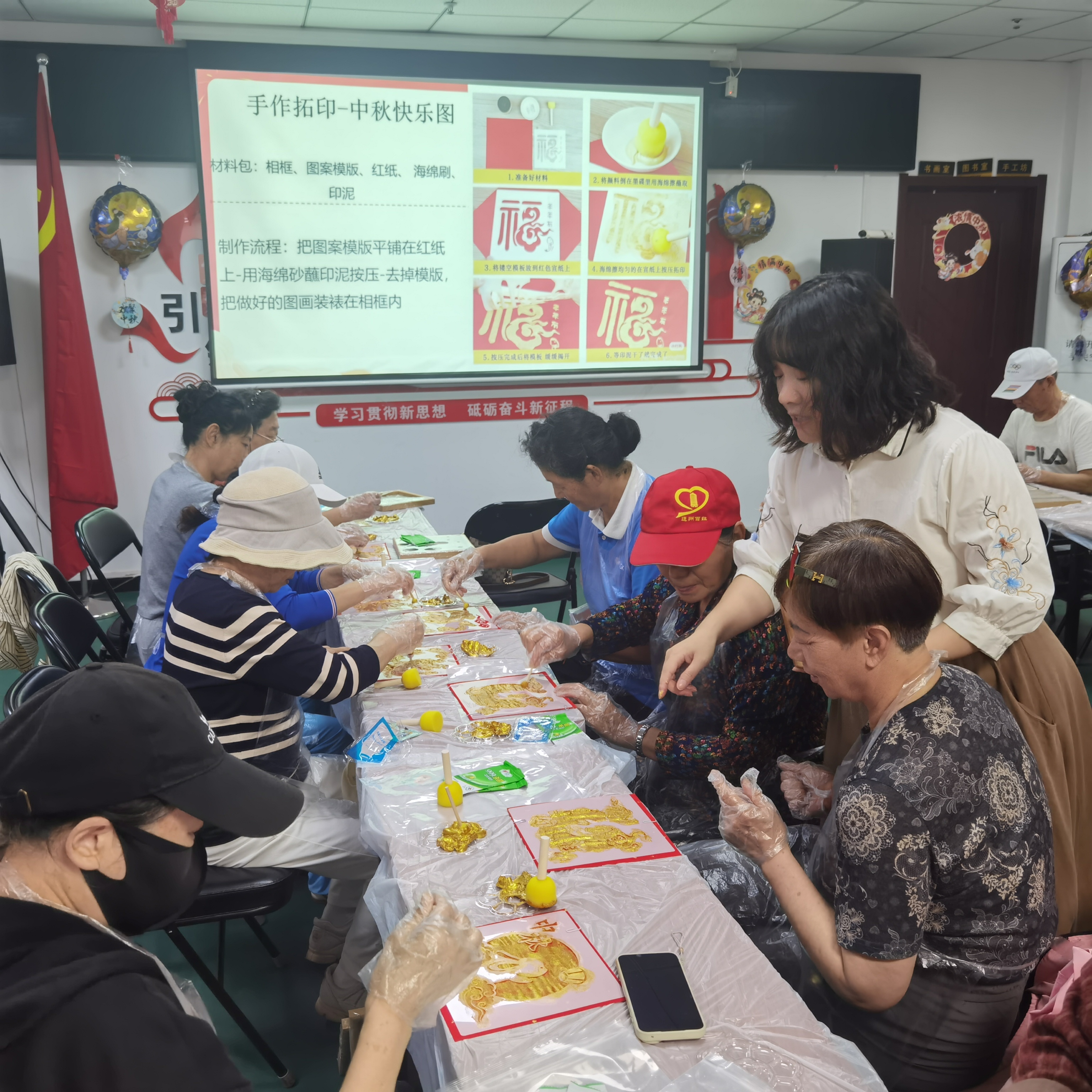 随后进入“乐中秋 - 手工拓印”环节。老人们手持海绵刷,蘸取金色印泥,将寓意吉祥的月兔、嫦娥等图案拓印在撒有金粉的大红纸上。指尖轻触纸面,仿佛穿越千年,与古人共赏同一轮明月。一幅幅拓印作品纯净如月光,承载着对团圆的祈愿。正如苏轼所说:“但愿人长久,千里共婵娟”,在这方寸之间,情意悠长。