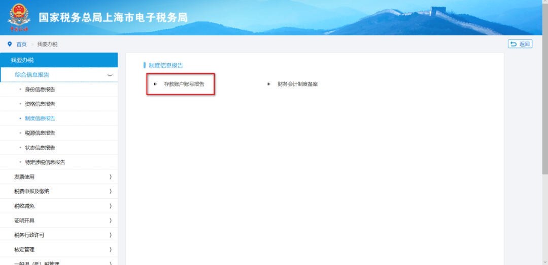 1.登录电子税务局,点击菜单栏中“我要办税”中的“综合信息报告”模块,在弹出页面左侧选择“制度信息报告”,选择“存款账户账号报告”,点击进入办理页面。