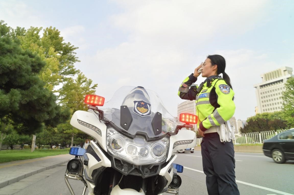 当路边和她们年龄差不多的女子大多数穿着相对清凉的短袖或裙子,撑着遮阳伞。而她们必需“全副武装”——头戴警用骑行头盔,身穿长袖长裤款式的骑行服,背10多斤警用装备,骑着600斤摩托在繁忙路段巡逻。由于路面车辆较多,她们在车流之中还必须时刻注意控制车速,加油门、握手刹、踩脚刹。她们也会在车上备一些药品,比如十滴水和速效救心丸,万一要有群众求助以备不时之需。