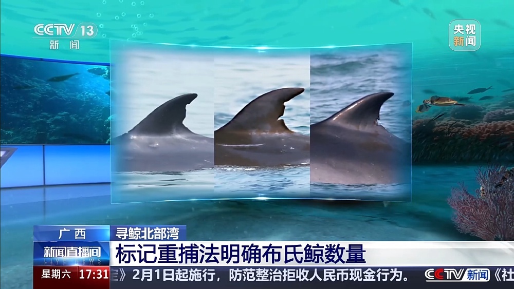 布氏鲸的数量是通过什么方式来统计的呢?通过图片可以看到,布氏鲸的背鳍上有一些缺刻,这些特征都比较稳定,它们的位置、深浅也各不相同。所以,科研人员运用标记重捕法,只要发现布氏鲸,就会第一时间拿起相机拍照记录。接着,通过大量照片的比对来进行个体识别,同时记录下每天拍到的分别是哪一头,再结合专业的统计方法和模型,进而就能推算出这一区域布氏鲸的大致数量。