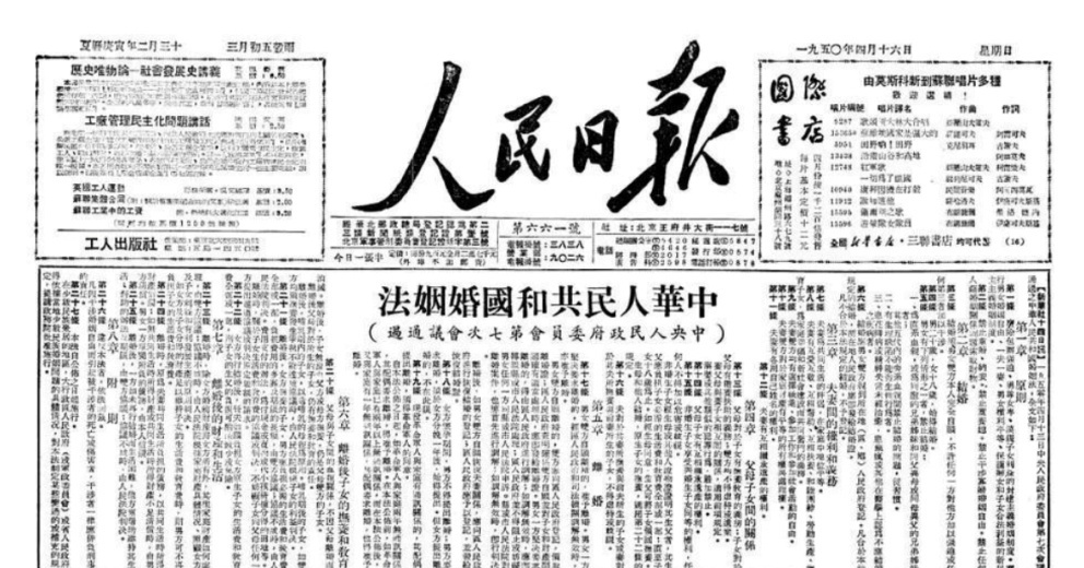 1950年4月16日,《人民日报》刊发《中华人民共和国婚姻法》