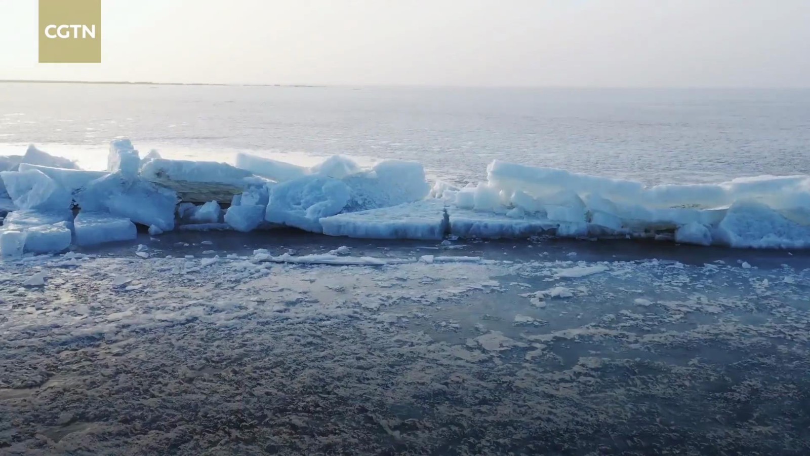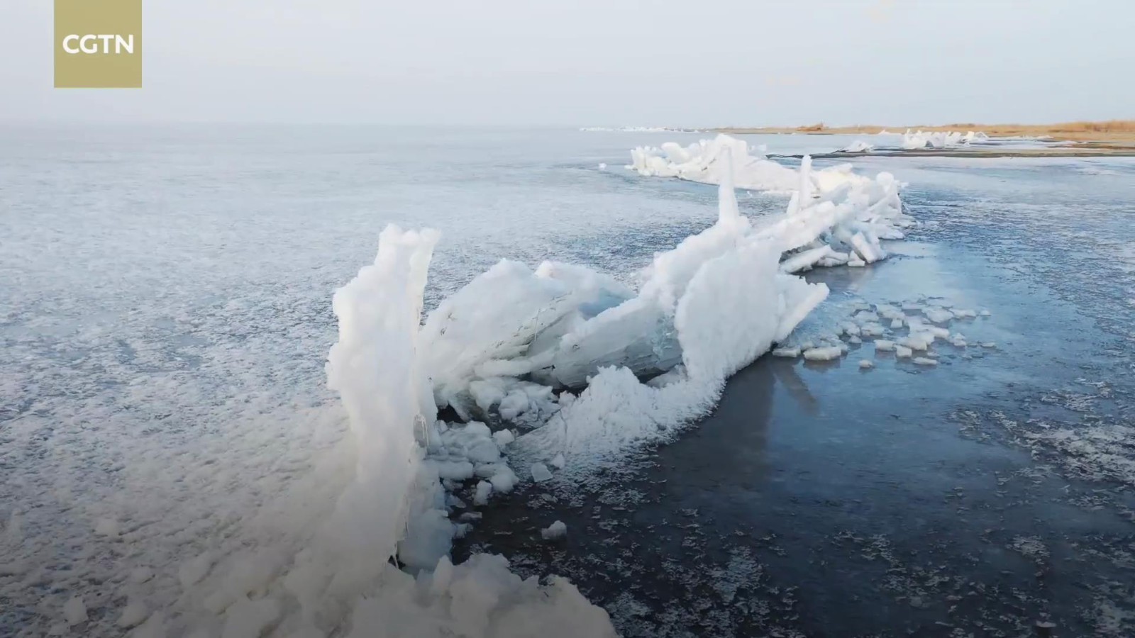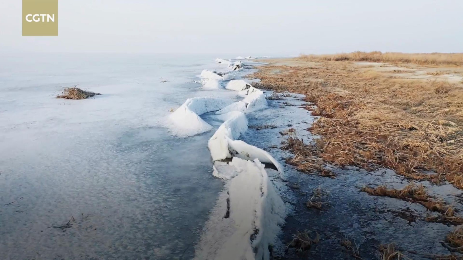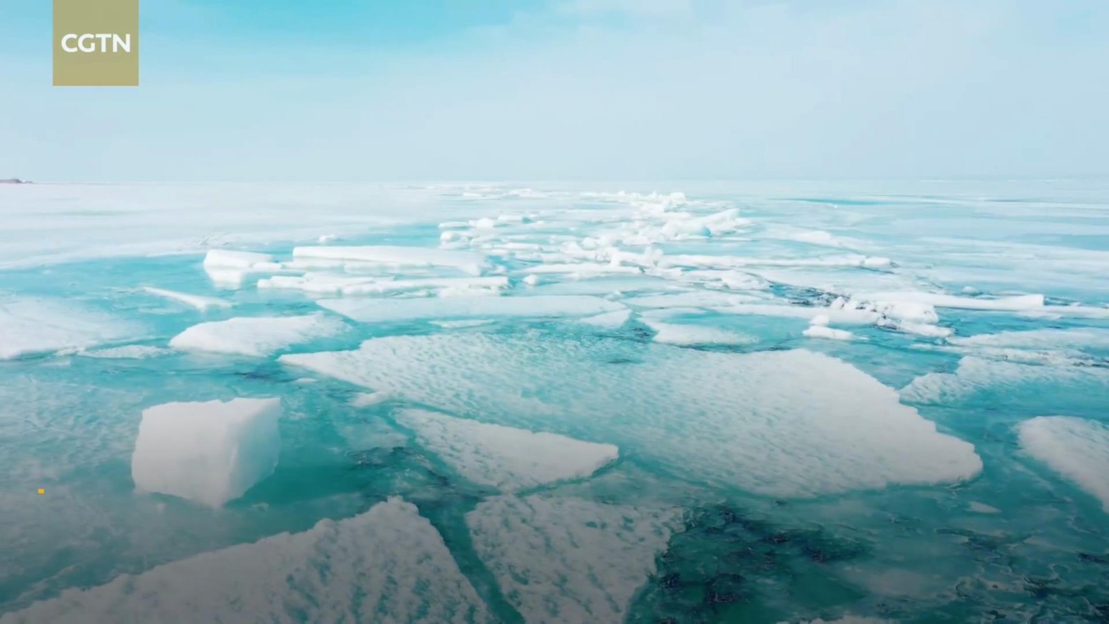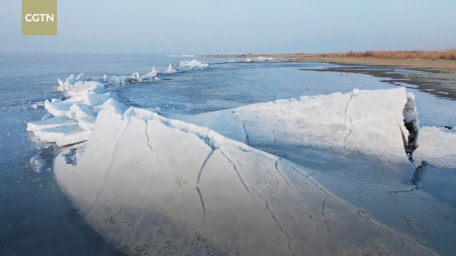 我国内陆最大淡水湖博斯腾湖出现推冰奇观,冰蓝、湖蓝、天蓝交相辉映,美如画~