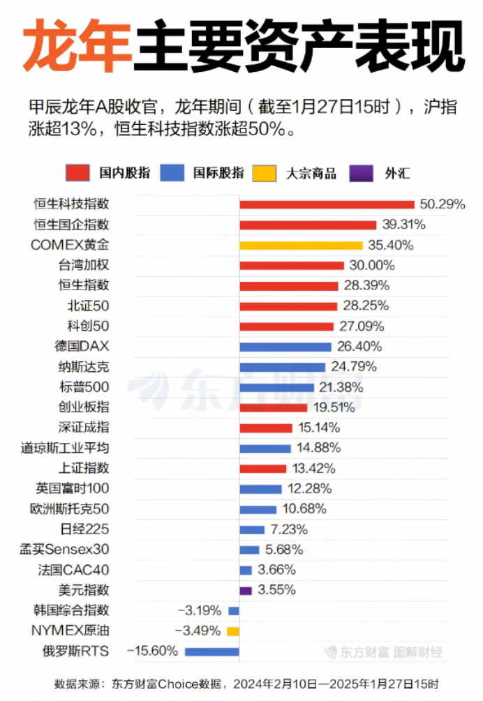 A股甲辰龙年行情收官,龙年期间(截至1月27日15时,下同),沪指涨超13%,深成指涨超15%,创指涨超19%,科创50指数涨超27%。