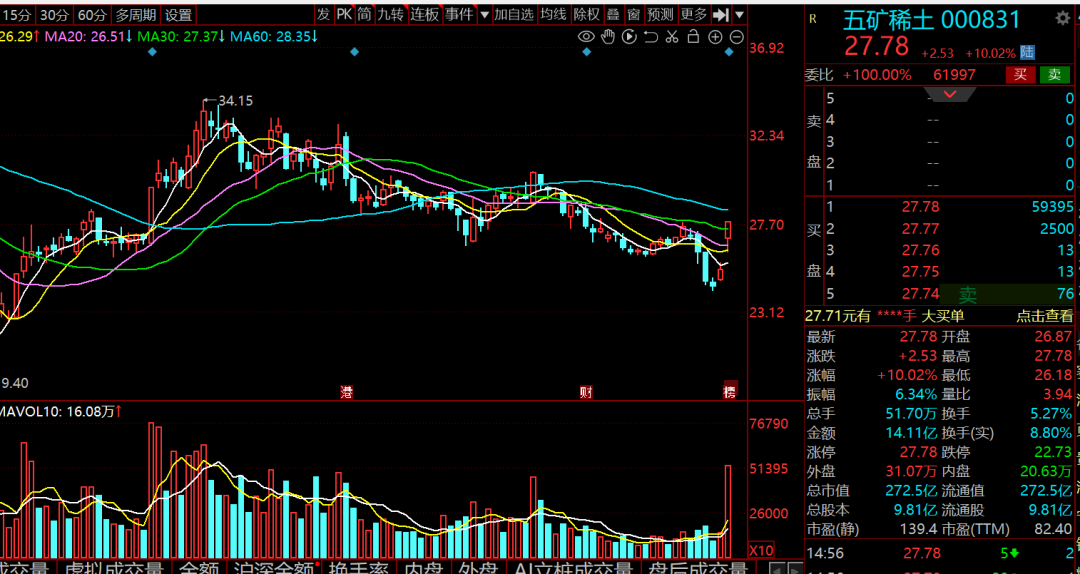 再来说说操作,今天午后盘中终于有了一抹亮色:五矿稀土涨停封板,华宏科技逼近涨停,北方稀土、中色股份、银河磁体、广晟有色等跟涨。