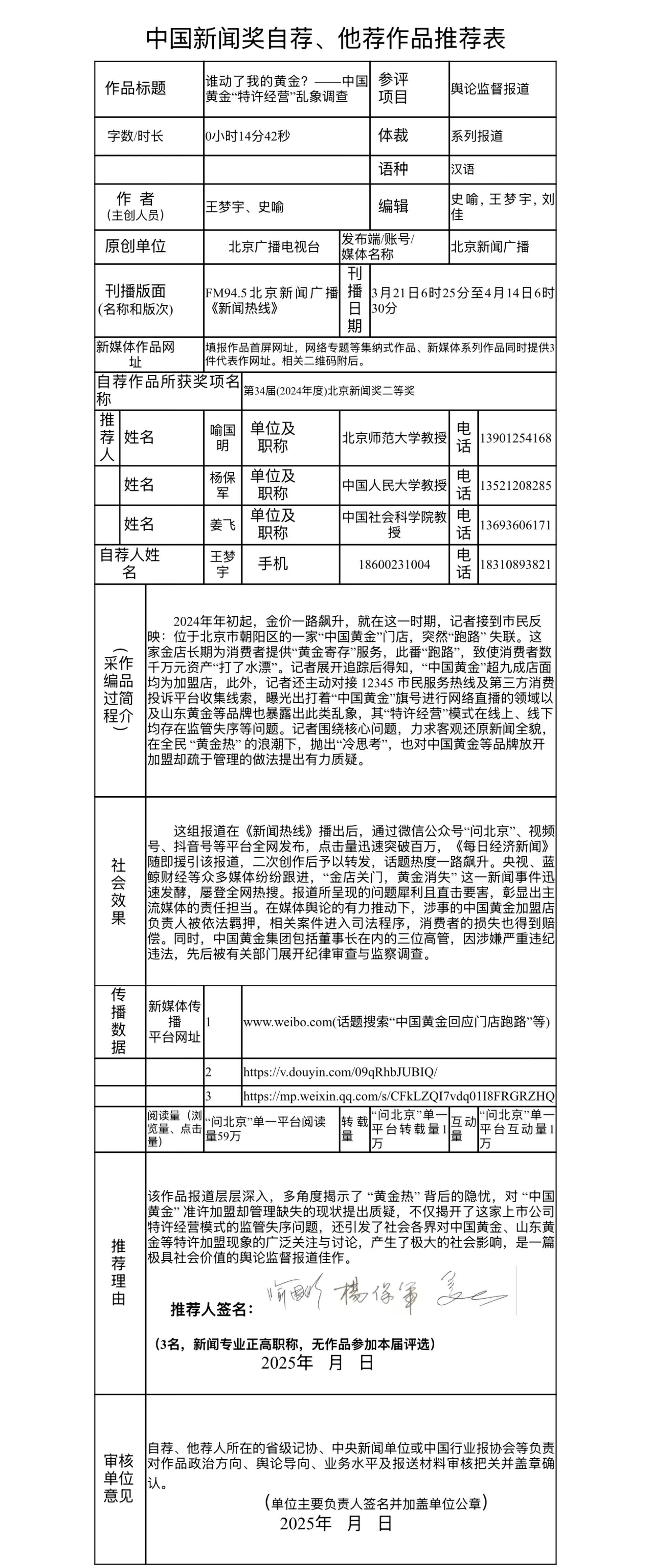 根据《中国新闻奖评选办法》和《第35届中国新闻奖参评作品报送通知》,北京广播电视台《谁动了我的黄金?——中国黄金“特许经营“乱象调查》,拟通过自荐、他荐的方式参评第35届中国新闻奖。