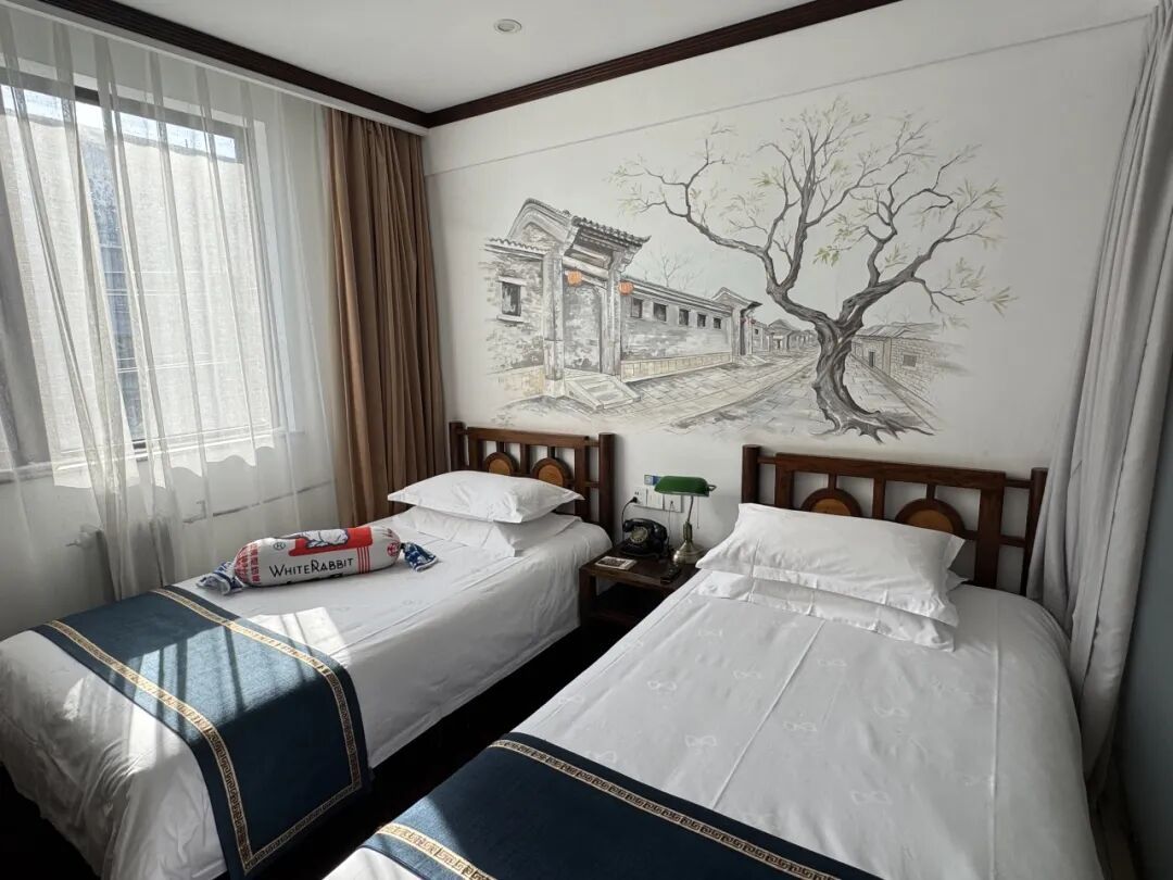 店长刘洋说,选址这里是因为有旅游属性,还是老的机床厂,有历史故事。酒店风格以怀旧为主题,家具是老榆木的,有手绘背景墙、80后和90后的小人书、老拨盘电话、老式台灯。因为中国免签政策,今年外宾增多,能达到总数的20%到30%。