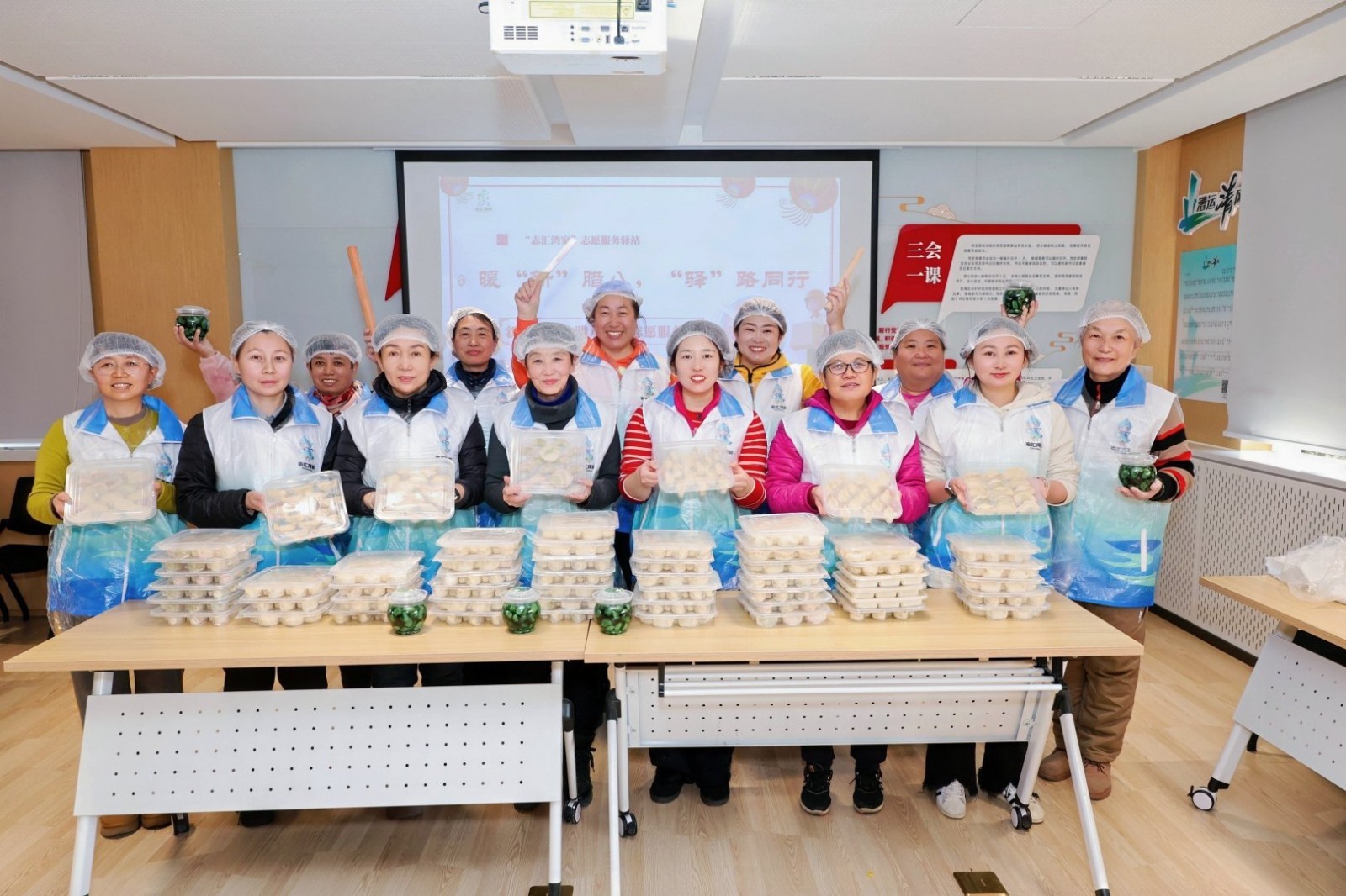 腊八前夕,“志汇湾家”志愿驿站在志愿者群内发出一份“为骑手众筹一顿腊八饺子”的线上倡议。不到半小时,10多位志愿者便接起了“爱心长龙”。家住月亮湾小镇的董大姐率先响应:“我擅长调白菜猪肉馅,馅料我在家备好带过去!”紧接着,“我来负责牛肉大葱馅”“我带擀面杖”“我可以提供蒸锅”……一条条简单的接龙,瞬间将分散的个体热情串联成具体的分工方案。从“我愿意”到“我来做”,志愿者们成为了温暖的主动制造者和邻里网络的积极编织者。