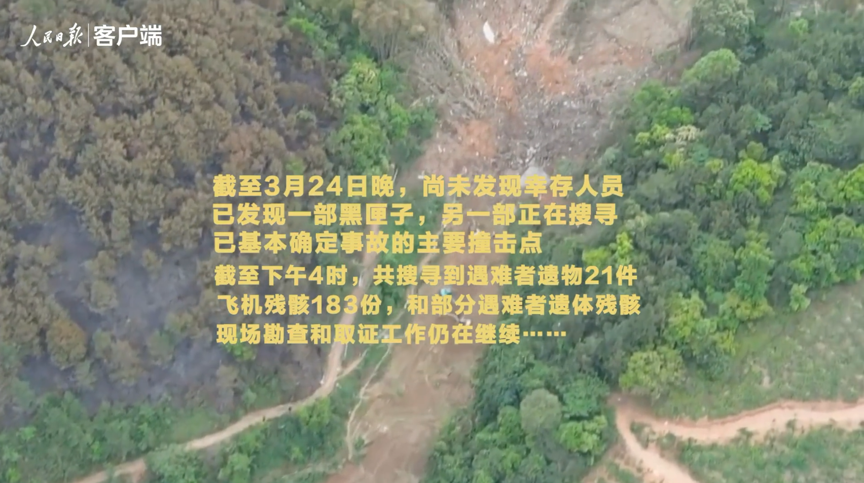 截至3月24日晚,东航MU5735坠毁已超72小时,搜救仍在继续。目前,已基本确定事故的主要撞击点,共搜寻到21件遗物183份飞机残骸。