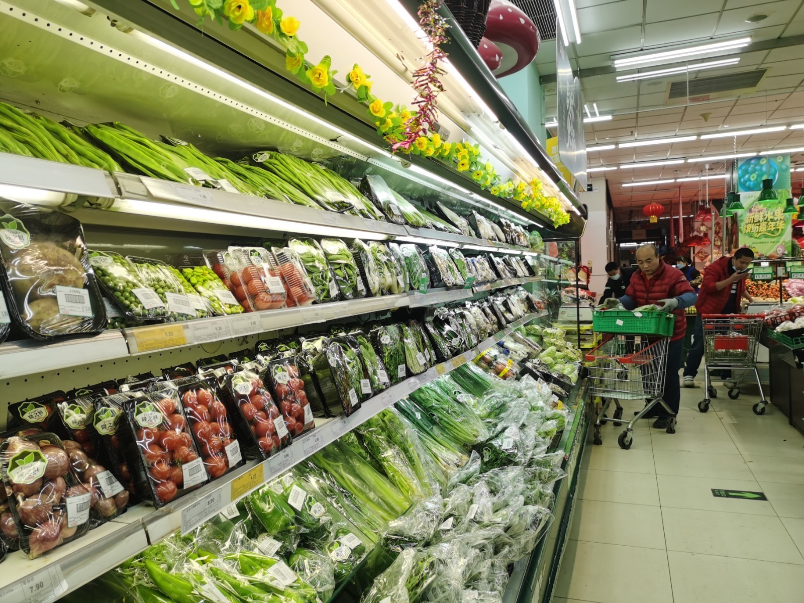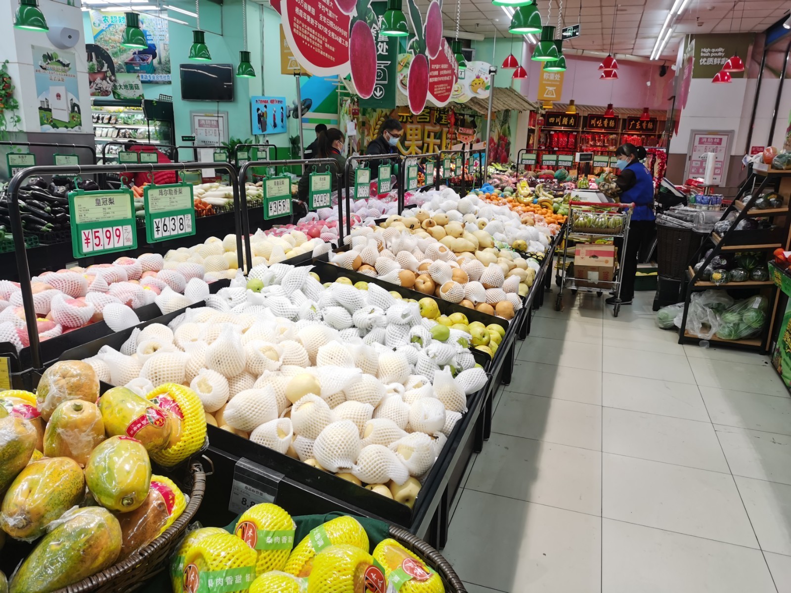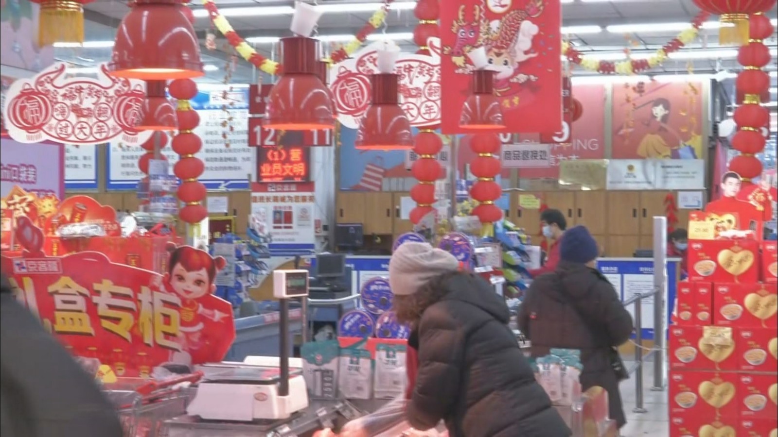小年到,年来到,一串串小红灯笼、牛年的卡通挂饰、色彩鲜艳的中国结……超市里浓浓年味扑面而来,营造出了喜庆祥和的氛围。