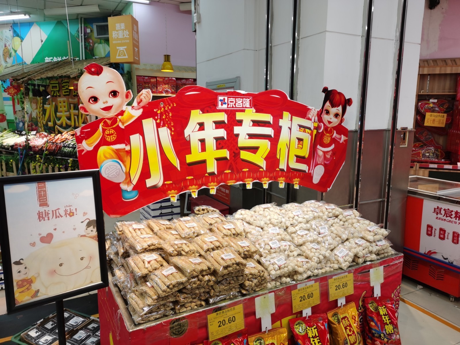 二十三糖瓜儿粘,“过年模式”开启啦,吃一颗又甜又粘的糖瓜,讨一个来年的甜蜜欢喜,老北京人把吃糖瓜作为“小年”的习俗之一,在甜蜜中进入准备年货的最后阶段,所以京客隆超市里的小年专柜也早就备好了糖瓜和关东糖。