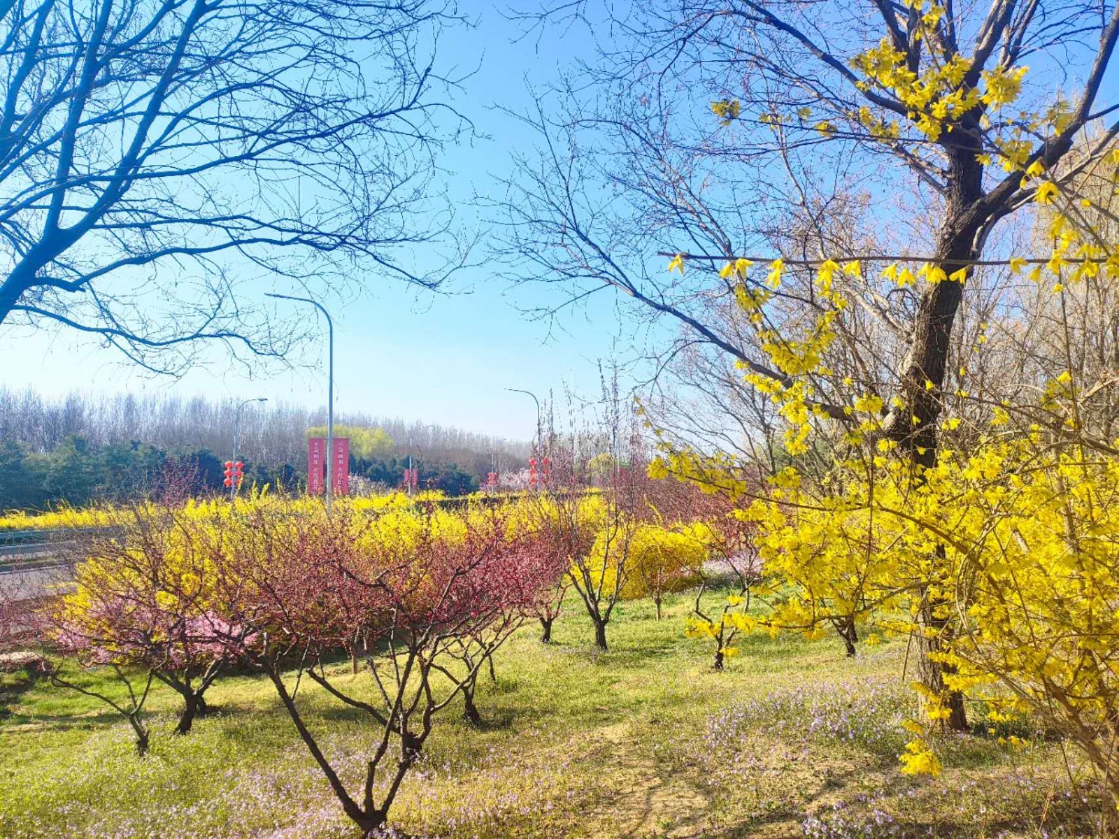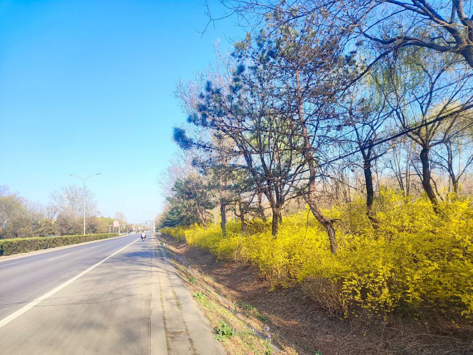 新平蓟路金色大道两侧景观林带宽达百米,栽植金叶榆、金叶国槐等金色系乔木,搭配连翘、迎春花等花灌木。早春时节,迎春花金花串串、明艳动人,与周边淡淡绿意相互映衬,形成“金辉漫路、流光溢彩”的独特景观。