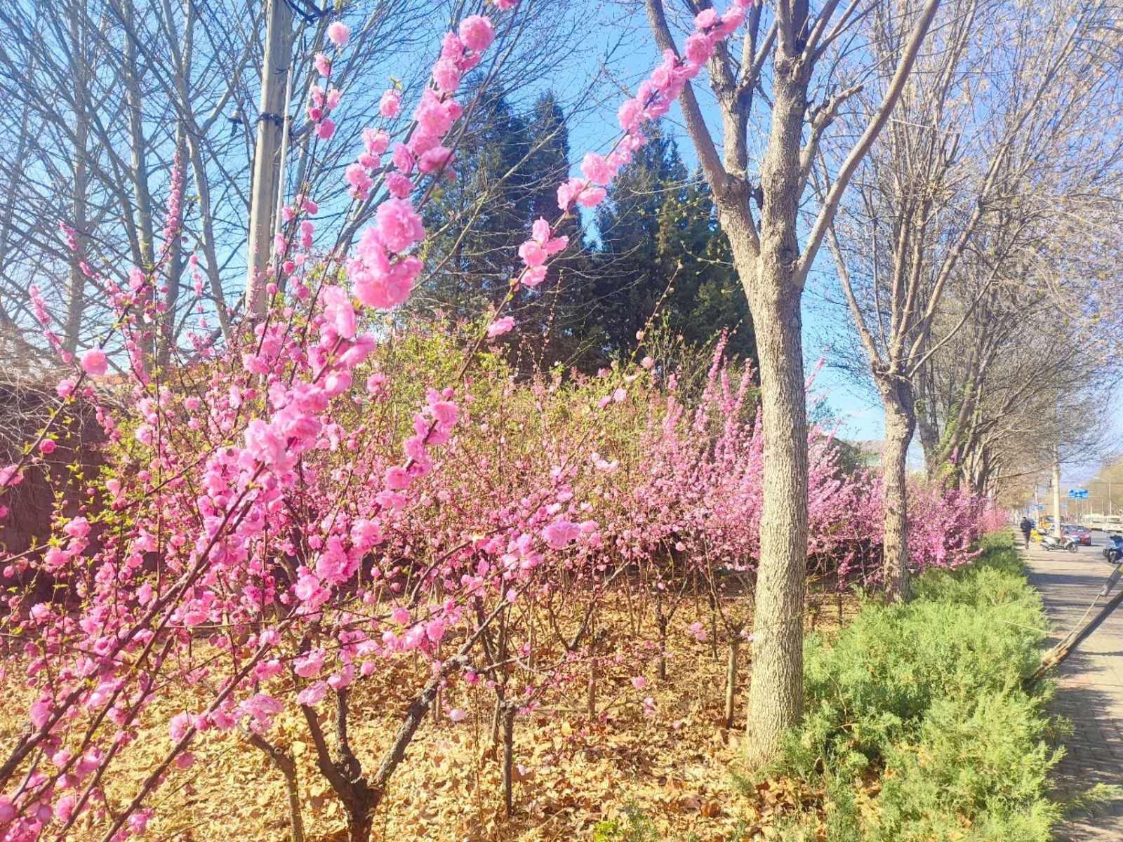 平翔路碧桃大道是万达广场周边一道靓丽风景,百余株碧桃热烈绽放,花色艳丽、花形饱满,深红、粉红、纯白交织相映,层层叠叠、繁花满枝,商业活力与生态美景相融,是城区春日赏花、休闲漫步的优选之地。