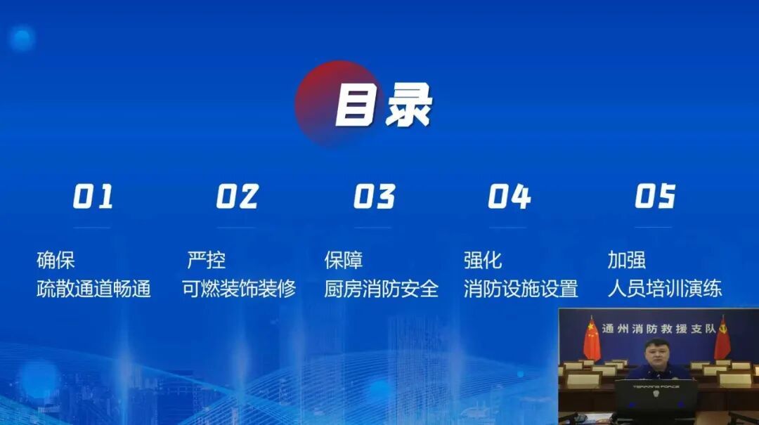 为进一步加强全区餐饮场所消防安全工作,提升餐饮从业人员的消防安全意识。3月2日上午,通州区防火安全委员会办公室联合通州区商务局组织开展全区餐饮场所消防安全管理人、负责人网络直播培训。