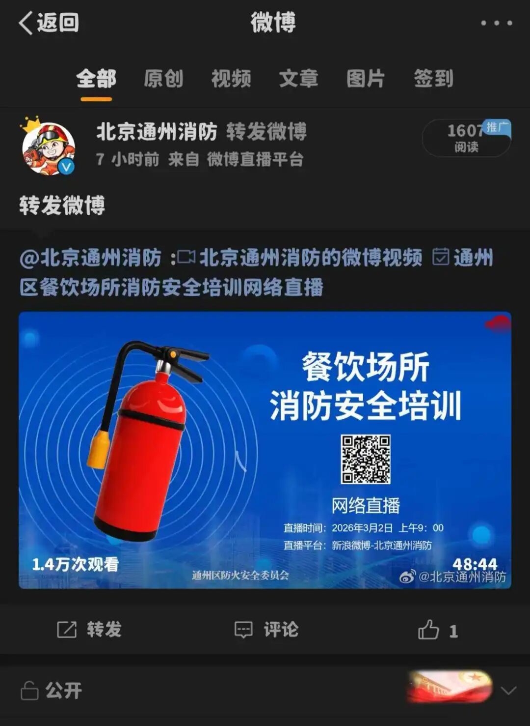 直播期间,全区22个街道乡镇1.3万家餐饮企业场所消防安全责任人、管理人等群体在线观看。