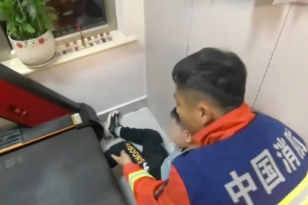 江苏省徐州市,两岁幼童靠近运行中的跑步机,左脚不慎卷入尾部缝隙,经消防员解救脱困。