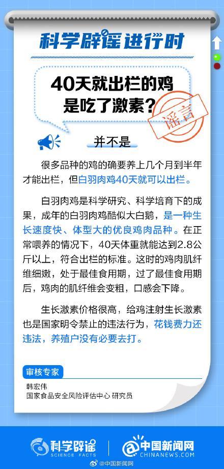 白羽肉鸡是科学研究、科学培育下的成果,成年的白羽肉鸡酷似大白鹅,是一种生长速度快、体型大的优良鸡肉品种。在正常喂养的情况下,40天体重就能达到2.8公斤以上,符合出栏的标准。给鸡注射生长激素花钱费力还违法,养殖户没必要去打。(@科学辟谣@中国新闻网 )