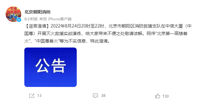 【谣言澄清】2022年8月24日20时至22时,北京市朝阳区消防救援支队在中信大厦(中国尊)开展灭火救援实战演练,给大家带来不便之处敬请谅解。网传“北京第一高楼着火”、“中国尊着火”等为不实信息,特此澄清。