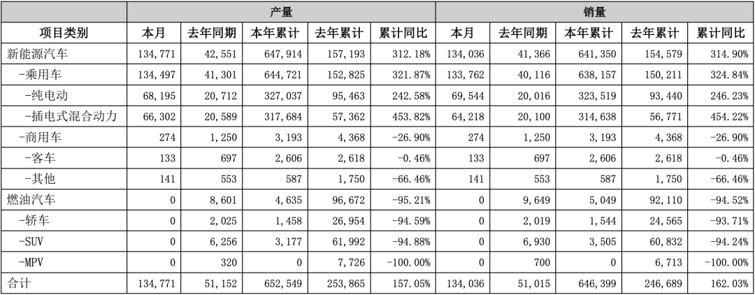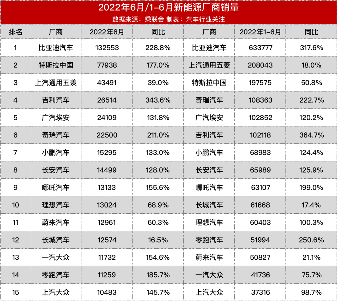 4月3日,比亚迪宣布停产燃油车,专注于纯电动和插电式混合动力汽车业务,成为全球首家宣布停售燃油车的传统汽车制造商,此举使得比亚迪新能源在二季度的销量急剧飙升。据乘联会数据显示,上半年比亚迪新能源汽车销量为63.4万辆,其中6月交付13.3万辆。