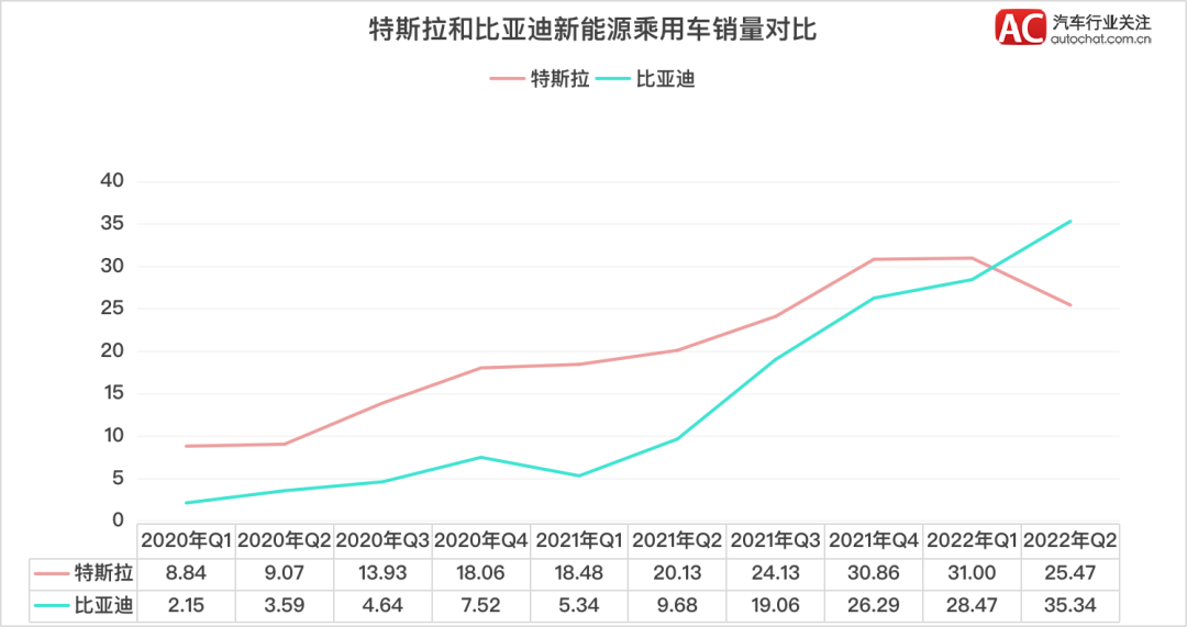 特斯拉发生了什么?据《电车报告》统计的《特斯拉和比亚迪新能源乘用车销量对比》可以看到,自2020年Q1开始特斯拉持续领先比亚迪至2022年Q1,但是2022年Q2突然被比亚迪反超,这是特斯拉自国产以来首次被超越。