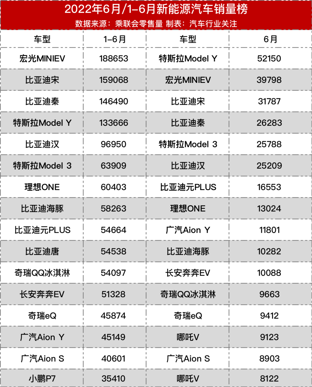 根据《电车报告》统计,2022年1-6月新能源汽车销量排名前三车企分别是比亚迪、上汽通用五菱、特斯拉中国,销量分别为633777辆、208043辆、197575辆。据统计,上半年共有6家新能源车企销量突破10万辆,其中比亚迪是唯一一家超过50万辆的车企。具体车型来看,作为微型车的宏光MINIEV再次夺得新能源销冠,累计销量188653辆。榜单中,比亚迪上榜车型最多,其中宋、秦两款车型分别为159068辆、146490辆,而Model Y也超过10万辆,为133666辆。