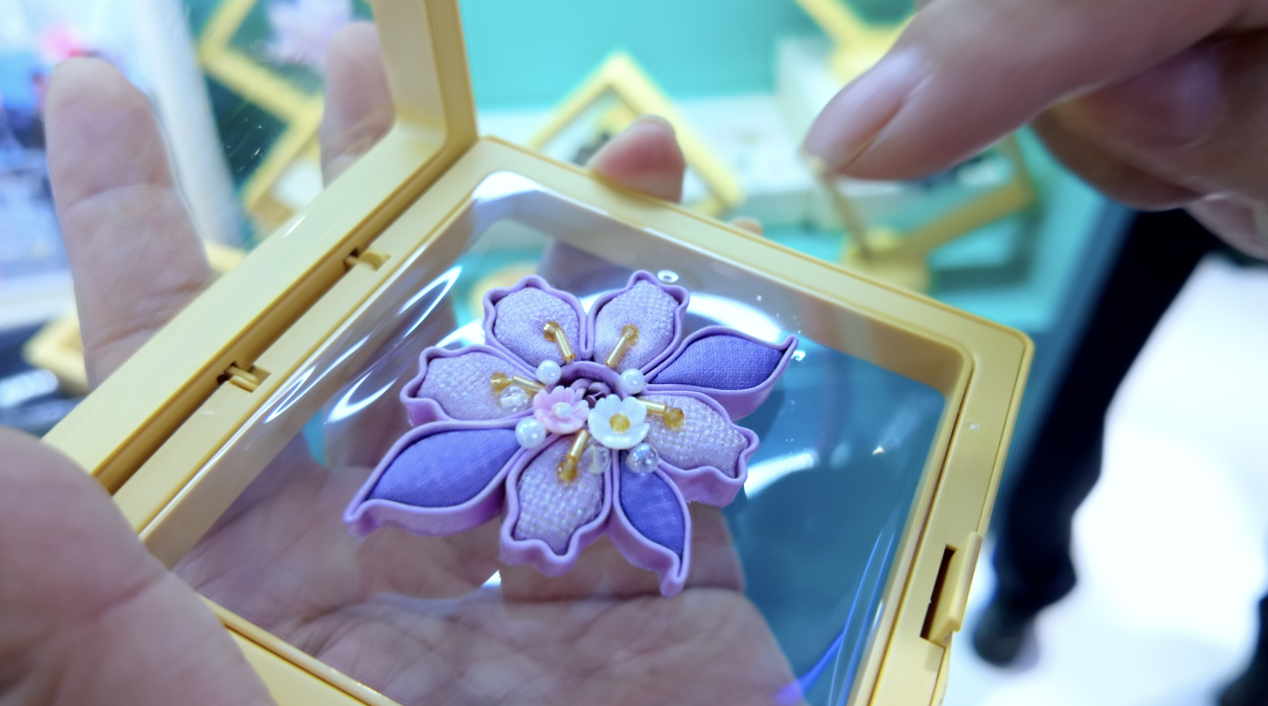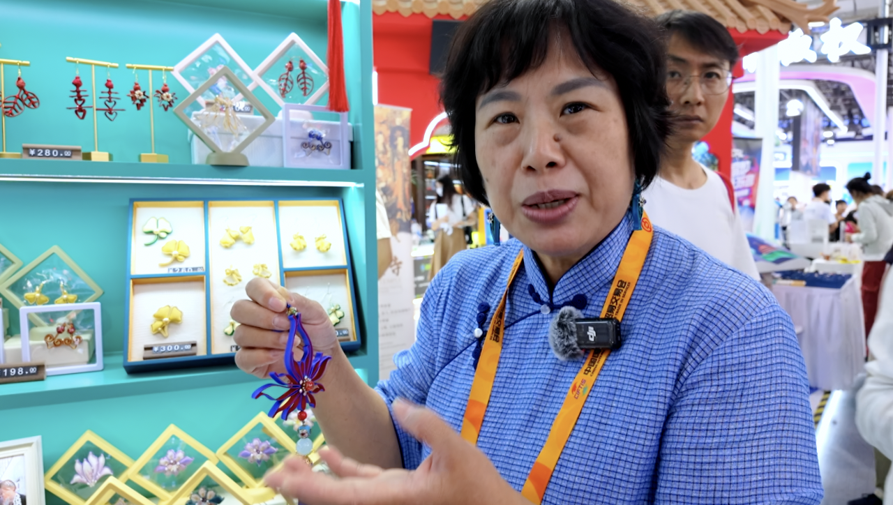 张凤兰:我们非遗项目到服贸会来,接到了海南的订单,客户是海南的一家上市企业。客户需求就是从海南元素的角度,来设计胸针、耳环、挂件等一系列文创产品。
