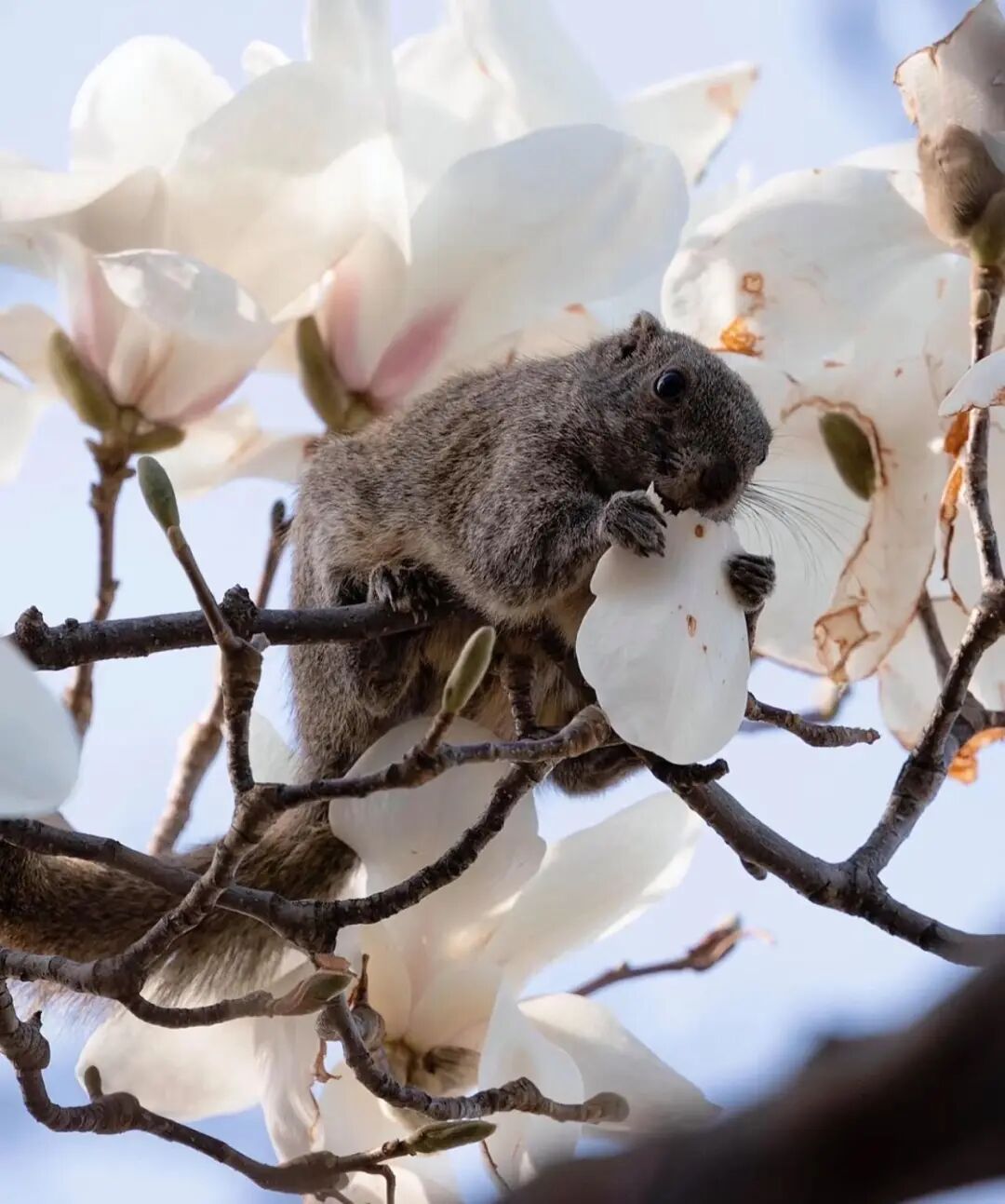 △天坛公园一只松鼠正在啃玉兰花瓣