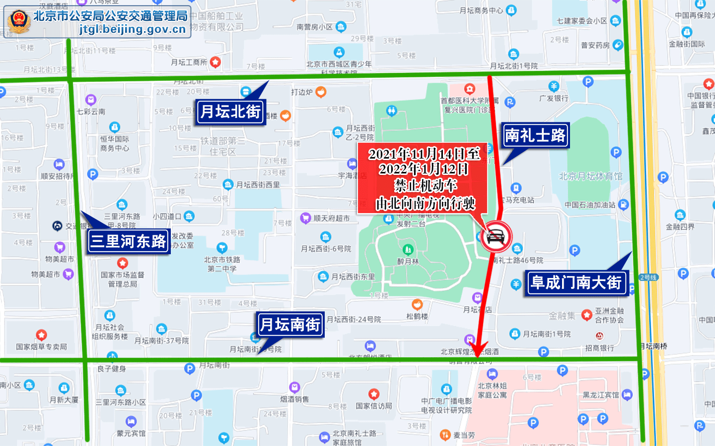经市有关部门批准,西城区南礼士路将进行污水管道施工。为保证施工期间道路交通安全与畅通,根据《中华人民共和国道路交通安全法》及《中华人民共和国道路交通安全法实施条例》有关规定,决定2021年11月14日至2022年1月12日,南礼士路(南礼士路与月坛北街相交路口至南礼士路与月坛南街相交路口)北向南方向禁止机动车通行,过往车辆可绕行月坛北街、三里河东路、月坛南街、阜成门南大街等周边道路通行。