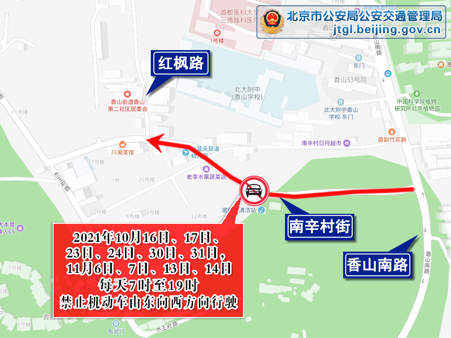 另外,为确保红叶观赏季期间香山地区的道路交通安全与畅通,2021年14日,7时至19时,对南辛村街(红枫路至香山南路段)采取禁止机动车由东向西方向行驶的临时交通管理措施。
