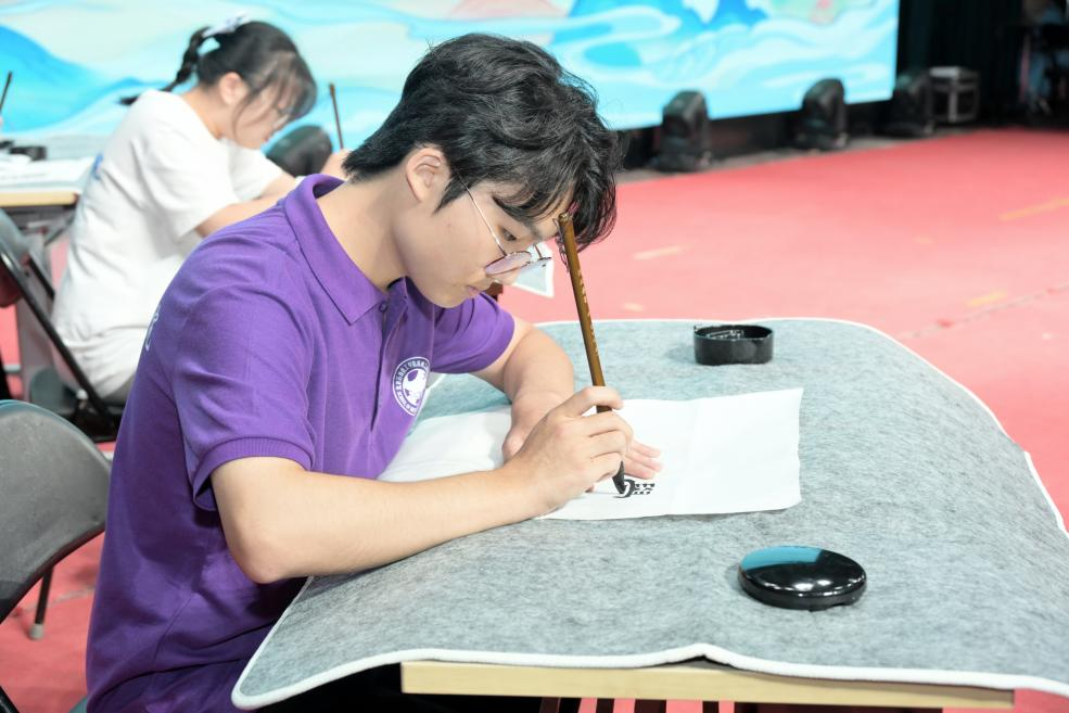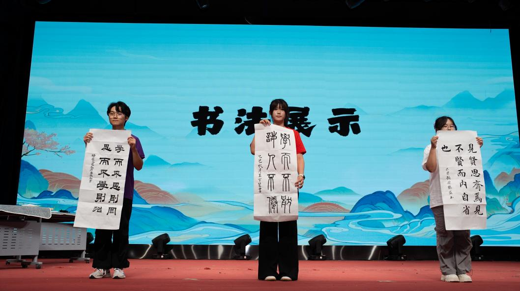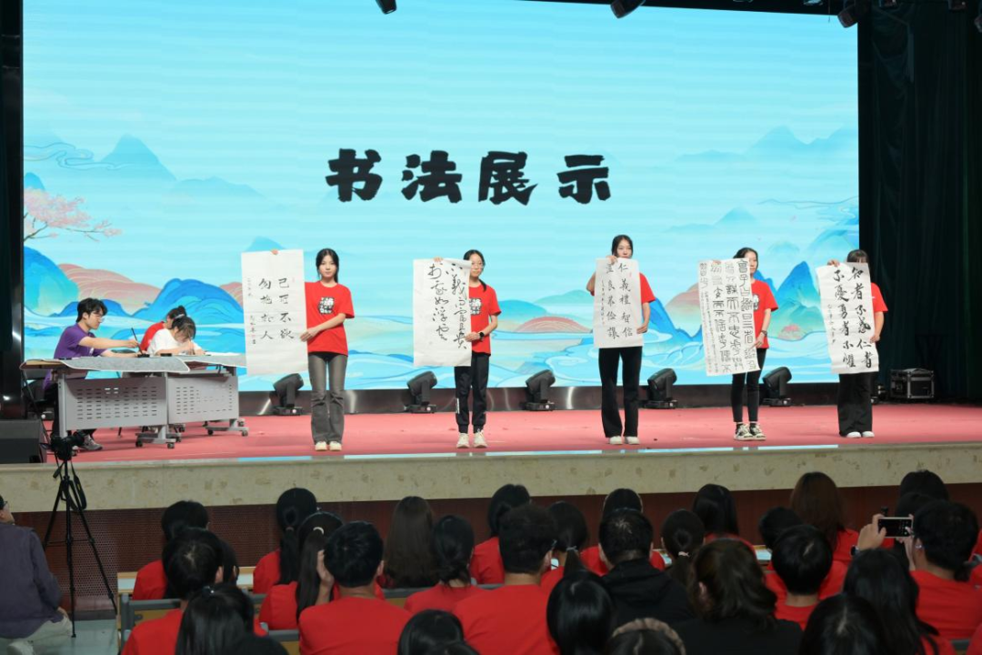 诵读声犹在耳畔,笔墨雅韵已缓缓开启。来自各学院的退休教师马裕华、任政民、王建设与在职教师赵春燕、冷文勇,以《论语》经典语句为主要内容,为活动提写了书法作品;活动现场,机械工程学院中德实验班机255李张驰、信息工程学院自251徐鹤益、人文社科学院人资251王宇萱三位同学,在铺展整齐的宣纸上现场挥毫创作,尽显青年学子对传统文化的理解与热爱。几幅作品各具特色,交相辉映,让师生在墨香中感受书法艺术的独特魅力,进一步深化对中华优秀传统文化的认知。