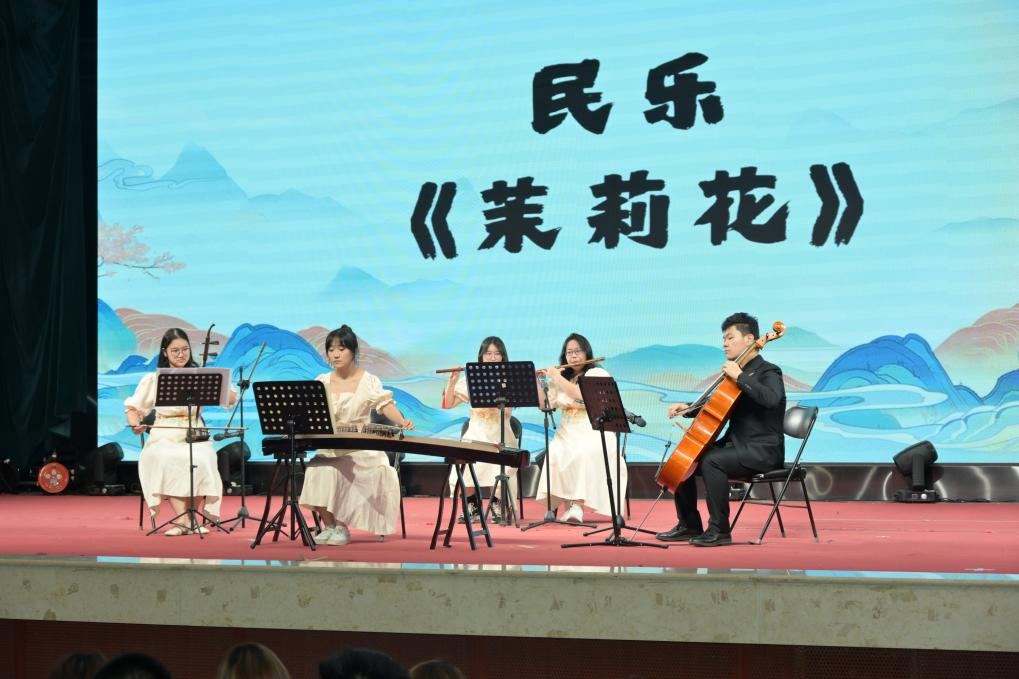 校民乐团演绎经典民乐《茉莉花》,五位学生手持古筝、二胡、竹笛等不同乐器默契配合,旋律灵动、节奏轻快,将《茉莉花》的清新雅致与传统民乐的独特魅力展现得淋漓尽致,赢得在场师生阵阵掌声。