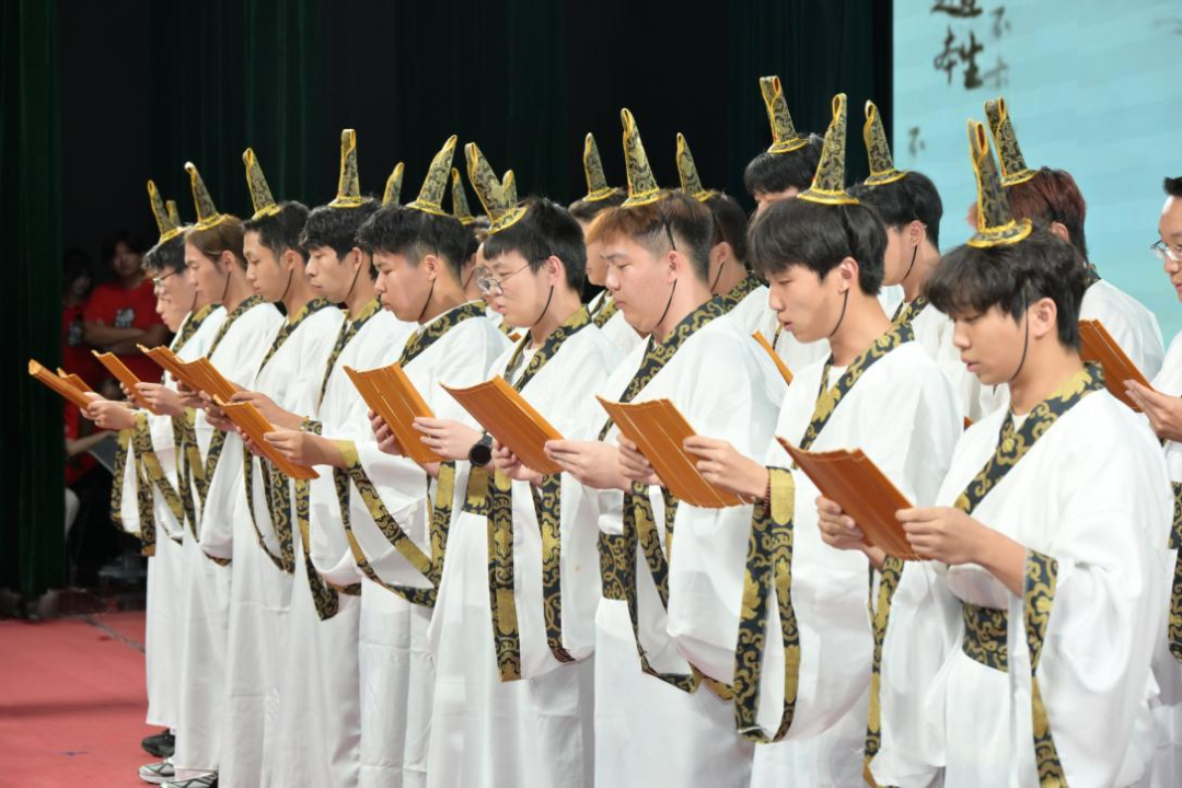 经典诵读将气氛推向高潮。30余名身着汉服的学生代表并肩登台领读,全体师生整理衣冠、肃立致敬,向孔子像行三鞠躬礼。礼毕后,全场齐声诵读《论语》的经典篇章,琅琅书声回荡礼堂,师生共同体悟古人对学问的追求与对人生的洞察,增强文化认同感与民族自豪感。
