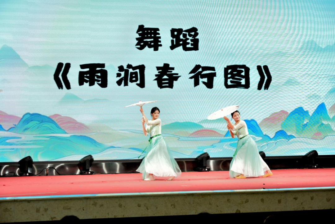 校舞蹈团带来舞蹈《雨涧春行图》,两名学生身着素雅舞衣,以灵动轻盈的肢体语言,将春日里的生机、温婉与诗意诠释得淋漓尽致,让在场师生沉浸式体悟传统文化的韵味。