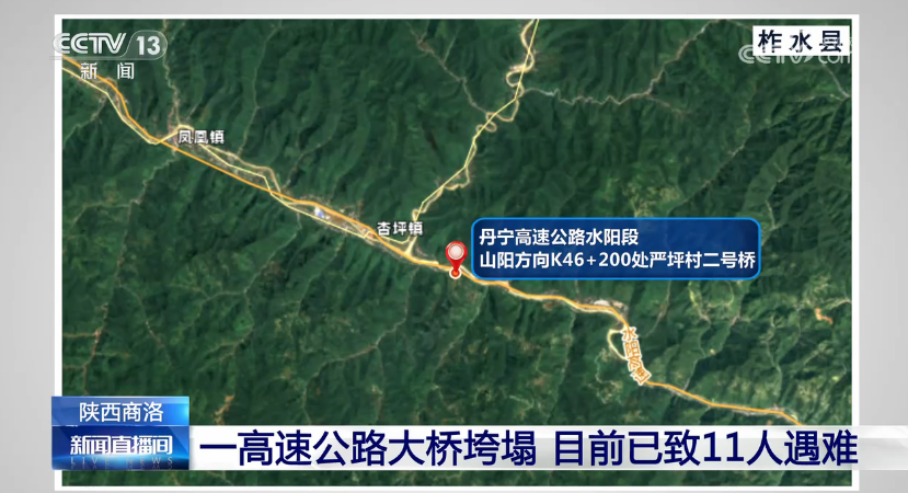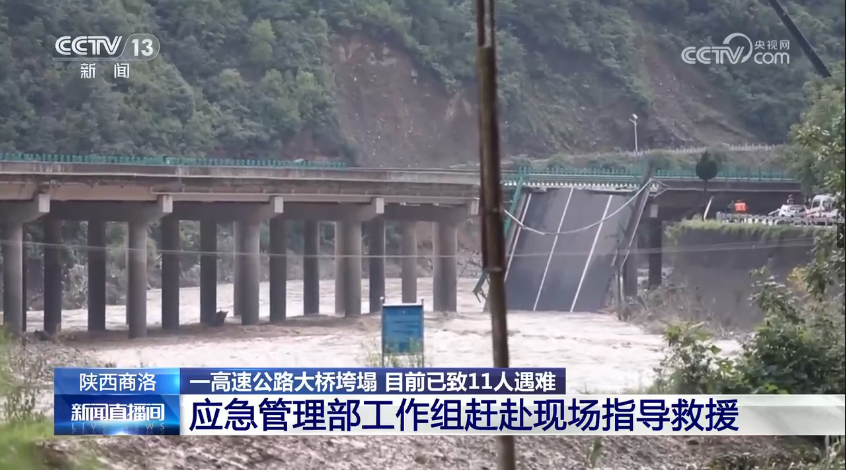 7月19日20时40分左右,陕西省商洛市柞水县境内突发暴雨山洪,导致丹宁高速公路水阳段山阳方向K46+200处严坪村二号桥局部垮塌。